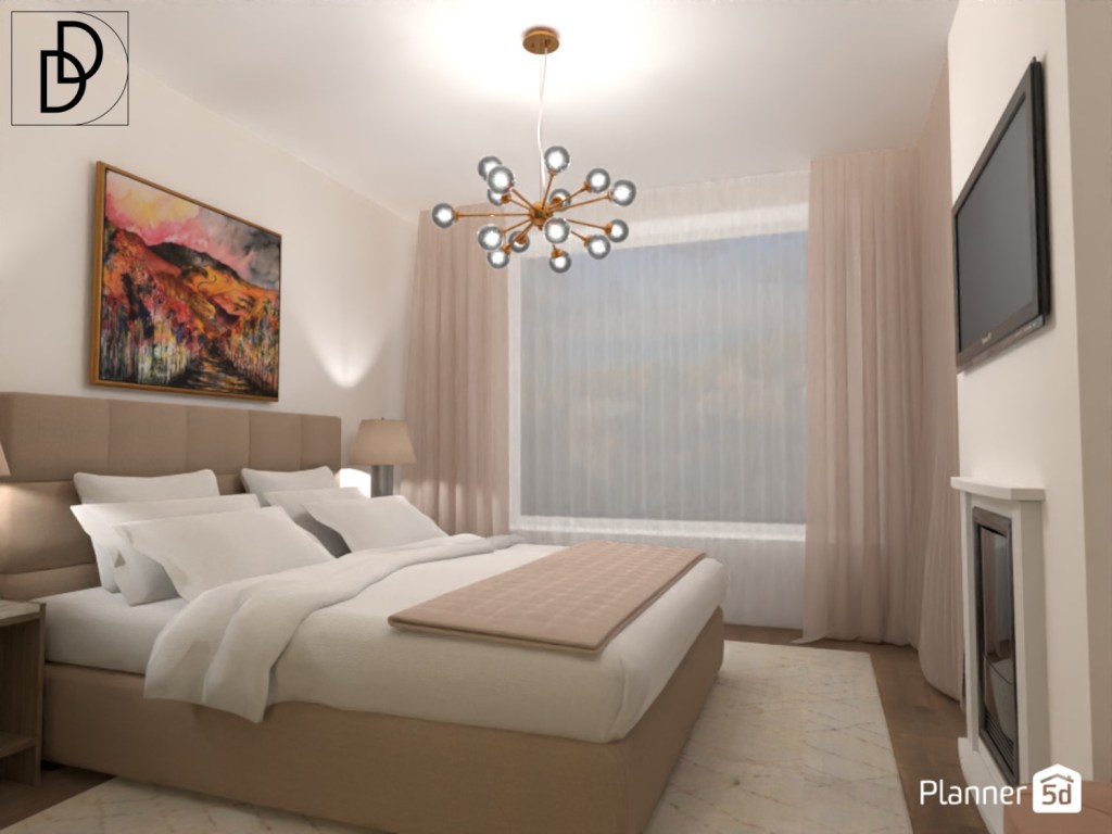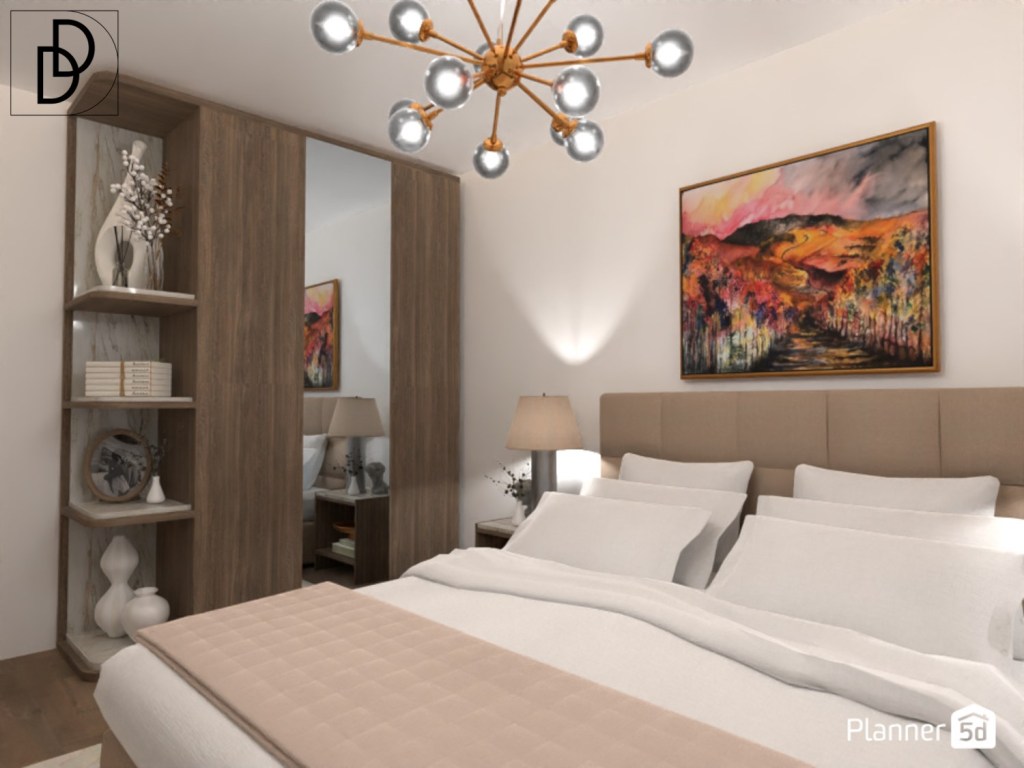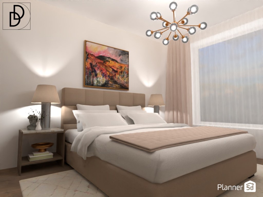 Цветовата палитра в спалнята е много изчистена в бяло, „Мока“ и „Бяло кафе“. Това прави атмосферата в стаята много спокойна и отпускаща.