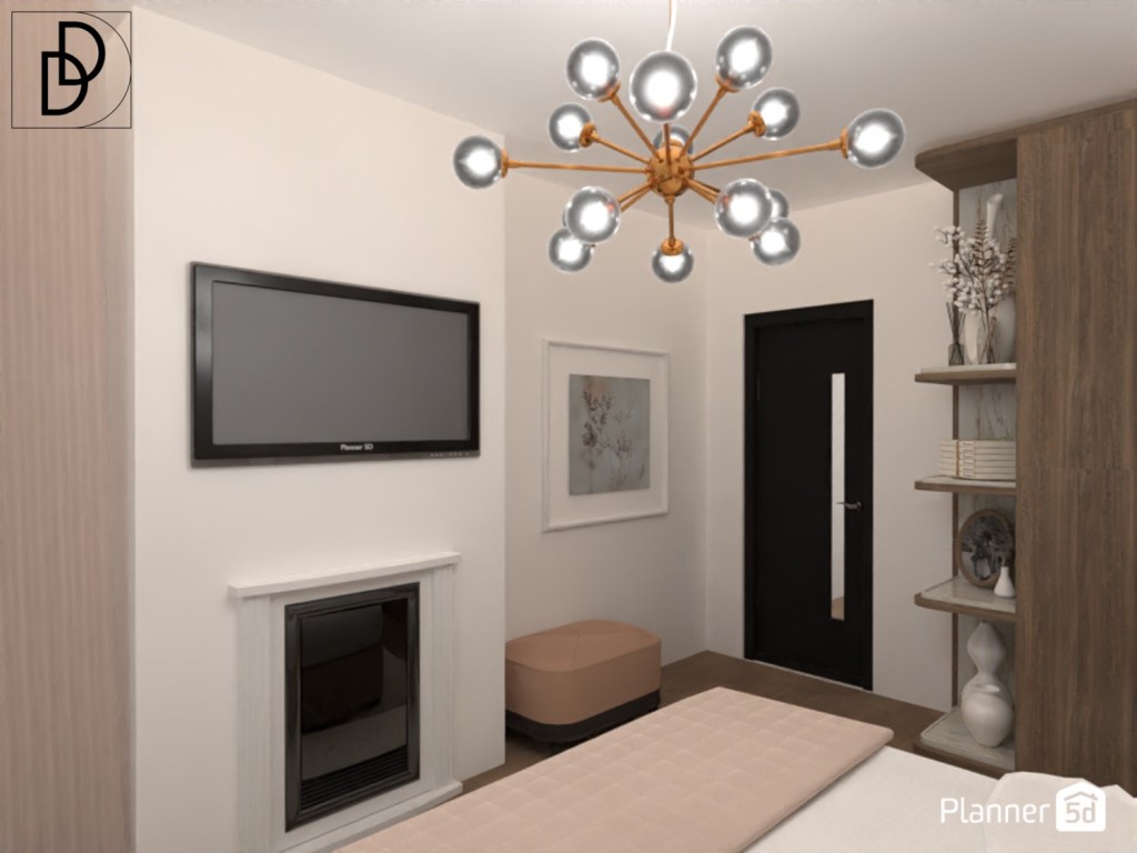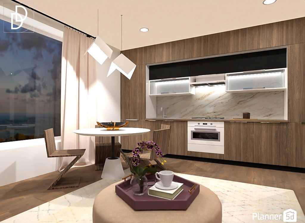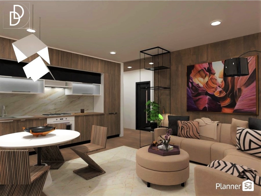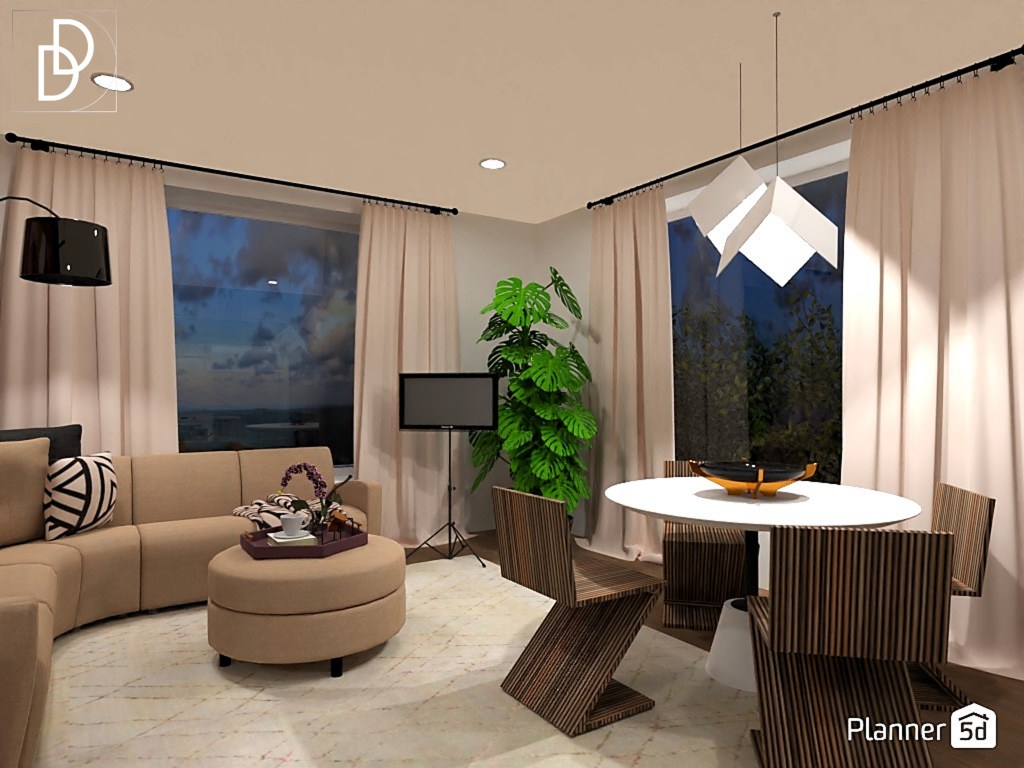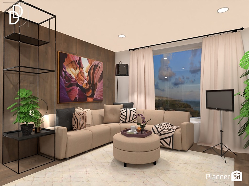 Дневната стая е почти квадратна, а две от стените са заети от обемни прозорци, което не дава възможност за нормална ТВ стена. Затова избрах да поставя телевизора на настолна стойка и вмъкнах голям ъглов диван в „Мока“ цвят с красиви овални форми. Вместо холна маса използвах отоман табуретка, която лесно може да се мести из помещението и да предоставя възможност за съхранение на книги, списания, одеяла и др. Високата до тавана метална етажерка има функцията да разграничи холното помещение от кухнята, а и да контрастира на овалните женствени форми на дивана. Поставих голяма черна подова лампа, за да балансирам пространството, а над дивана окачих репродукция на картината „Антилопа каньон“ от Майкъл Макграт.