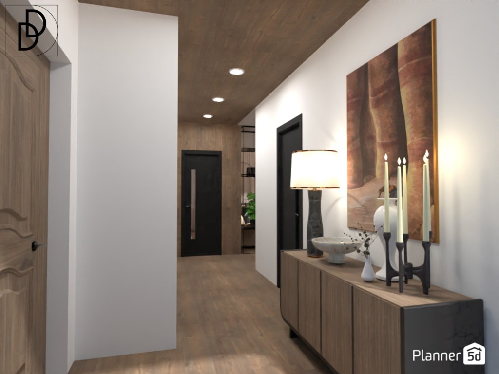 Тъй като дневната стая на жилището няма врата, ламинирах не само пода, но и тавана на антрето, както и вътрешните външни стени на спалнята, за да създам усещане за уютност и единност, и да осигуря плавен преход между помещенията. Картината над конзолата в антрето, която е репродукция на „Знаци от миналото“ на Джак Малок задава интериорната тема, а и изглежда визуално да „придържа“ тавана. На мнение съм, че при възможност винаги е добре да се включват подобни интересни елементи в интериорния дизайн на един дом.