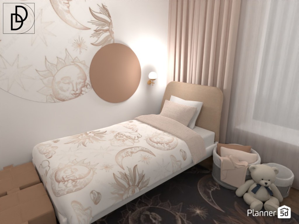 Палитрата на детската стая е по-разчупена, по-цветна и с лека заигравка с мотивите, за да внесе интерес и динамика без да нарушава цялостното усещането за уединение и сигурност.