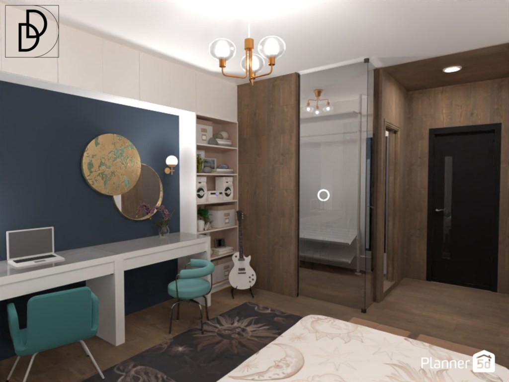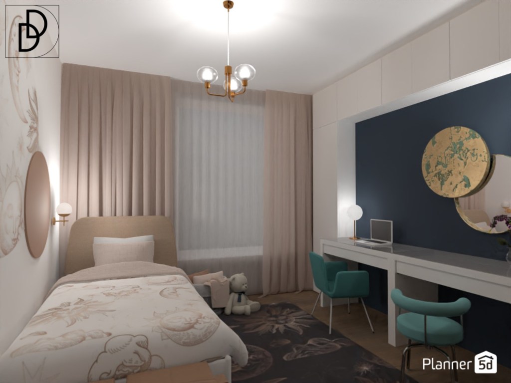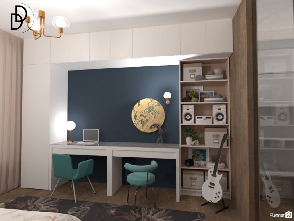 Проектирах стаята за момиче тийнейджър. Поставих две еднотипни бюра, но с различна функция – едното като място за учене, а другото като тоалетна масичка. Различните столове в кадетско синьо допълнително подчертават това. Интересен елемент представлява златистото огледалото със синкави вени и с плъзгащ се капак. От една страна то уравновесява тоналностите в стаята, а от друга страна обединява помещението.
