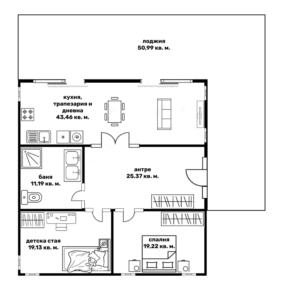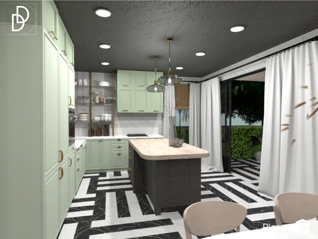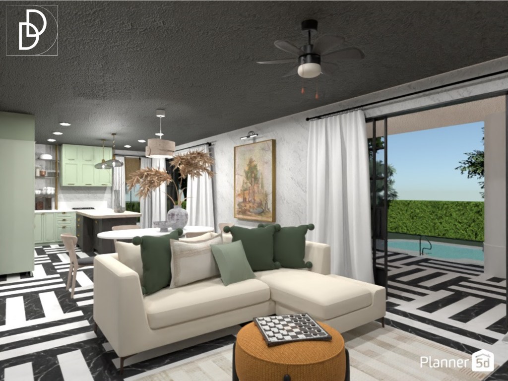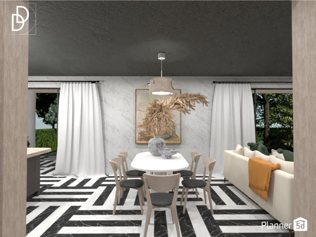 Дневната стая е с т.нар. отворена пространствена концепция или в едно помещение са събрани кухня, трапезария и хол. Обикновено, за да поместим в едно помещение кухня с кухненски остров, трапезария и всекидневна и всяко едно пространство да се чувства просторно и да функционира добре само по себе си, са необходими минимум 35 квадратни метра чиста жилищна площ. В конкретния случай помещението е над 43 кв. м., което позволи да разположа в кухнята и кухненски остров, който обърнах с лице към външната веранда на вилата.
