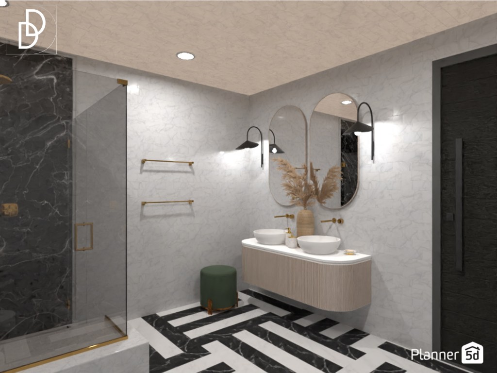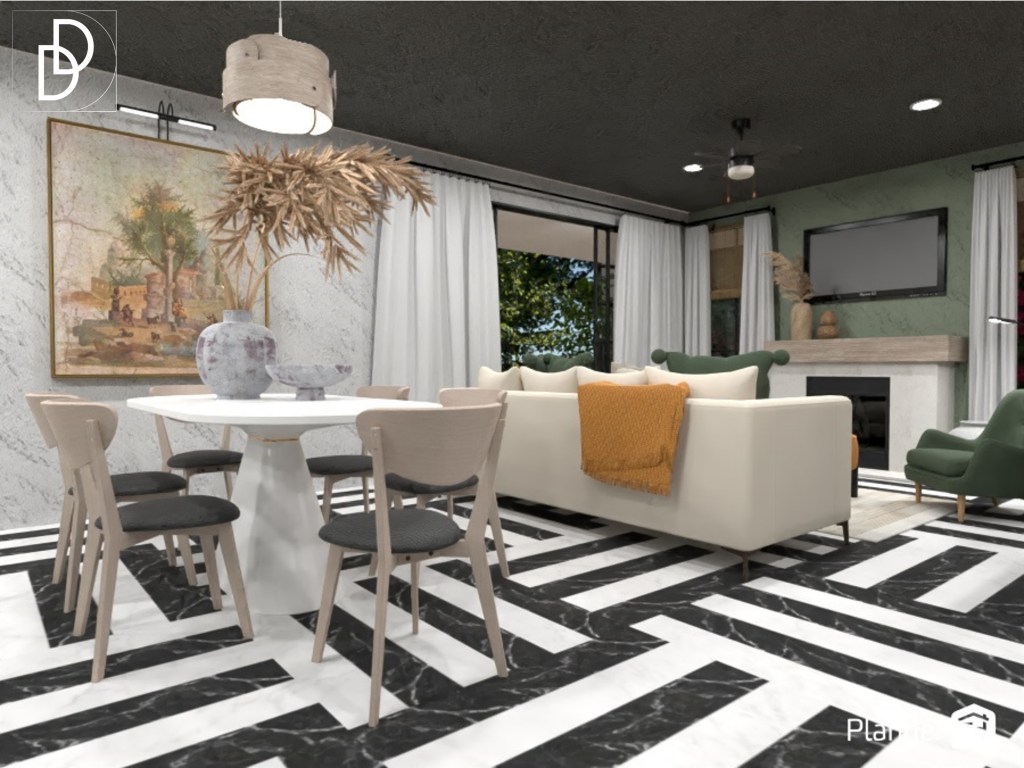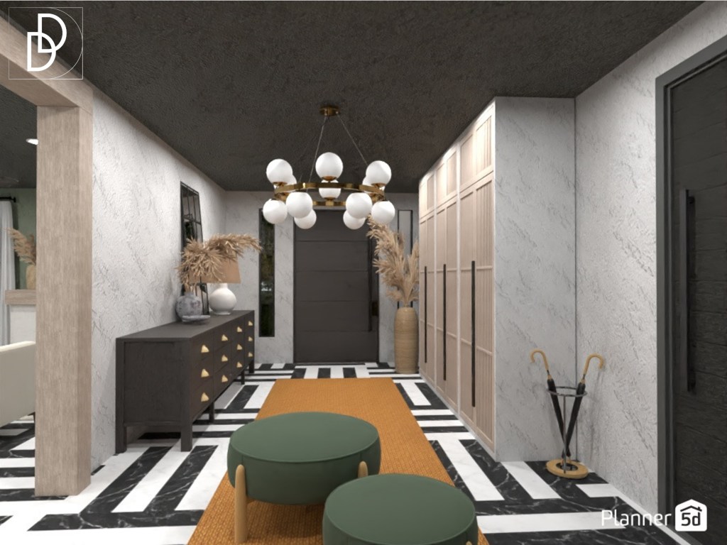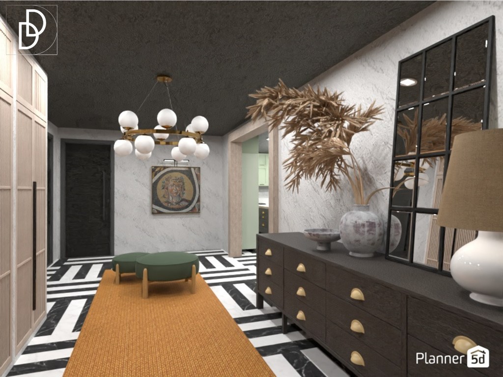 Подът на антрето и всекидневната стая покрих с мраморни плочки в бял и черен цвят. Вместо традиционните такива ромбоидни черно-бели плочки, избрах те да бъдат с по-модерен и разчупен мотив. Според мен, този вид подово покритие винаги внася „УАУ“ фактора в интериорния дизайн на дома. Мисля, че комбинацията, която се получи между мраморните плочки, венецианската мазилка и цветовата палитра, придаде интригуващо, леко шик и същевременно много комфортно усещате на дома.