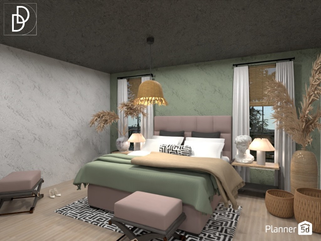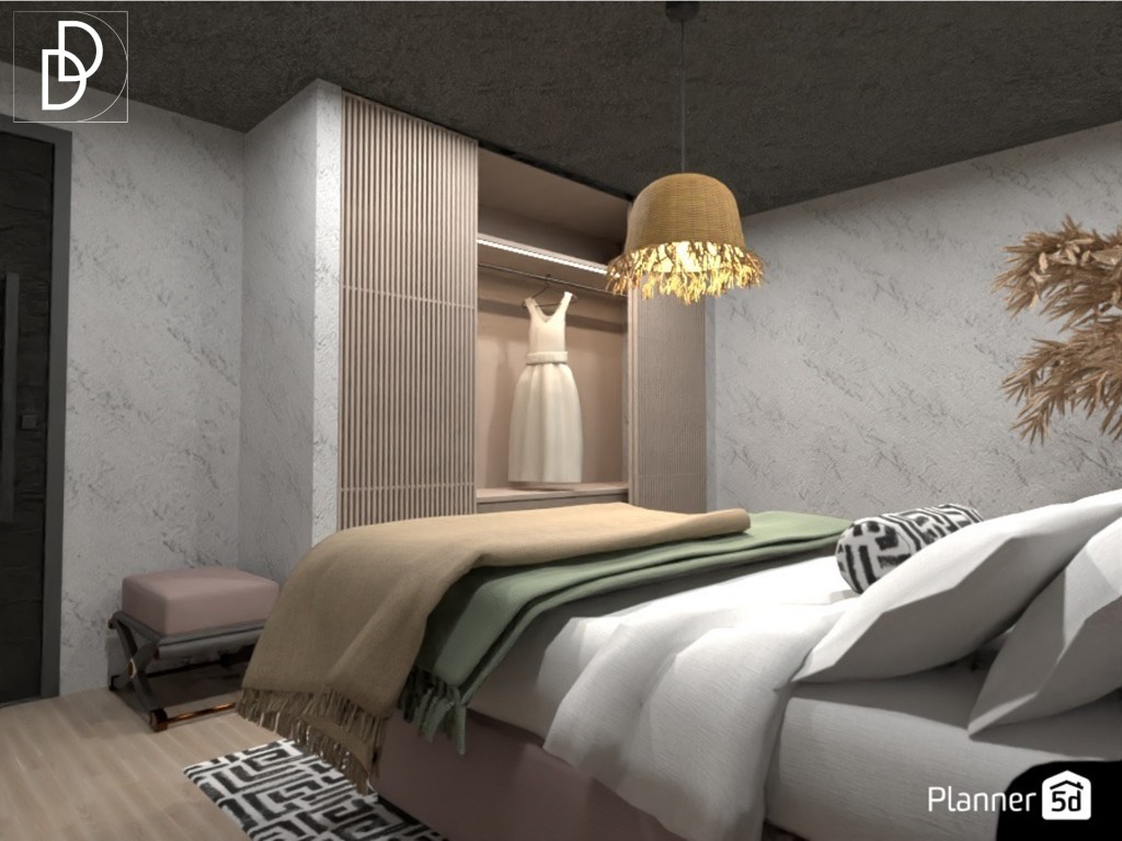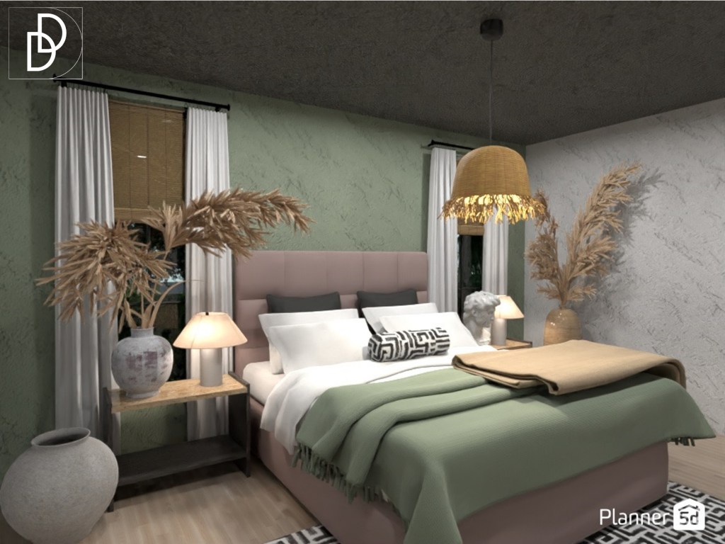 В спалнята на родителите исках да създам усещане за лятна бурна нощ вътре в помещението. За да го постигна използах метода на наслояване на различни текстури в цветовата палитра на дизайна. Вмъкнах и текстил с характерни мотиви за Древен Рим. Нощните шкафчека имитират прозорците над тях, за да не прекъсват линията на погледа от пода до тавана. Така мястото изглежда по-просторно, въпреки многото тъмни цветове в декора.