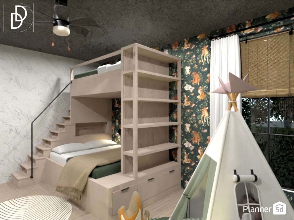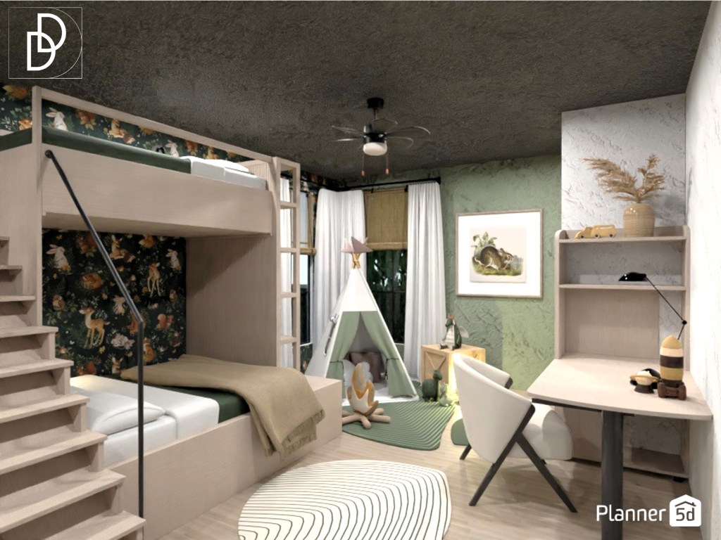 В детската стая обособих няколко зони – за спане, за съхранение на дрехи и багаж, за учене и за игра. Отново исках да създам усещане, че децата се намират навън сред гората и нейната зеленина, ето защо една от стените декорирах с тапет с горски мотиви.