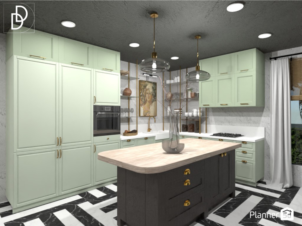 В кухнята комбинирах кухненски шкафове до тавана и отворени стъклени лавици с позлатени метални елементи. С лавиците и мивката в рустик стил придадох по-селски вид на кухнята. За кухненския плот използвах изчистен бял гранит. Взех решение да не включвам бар столове в дизайна. Така единственото място за хранене остава трапезарията, което означава, че семейството ще се събира по-често заедно, което е и основната цел на една ваканционна вила на село.