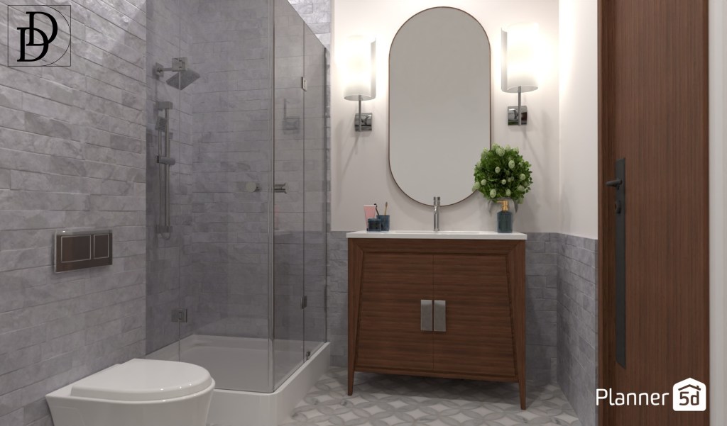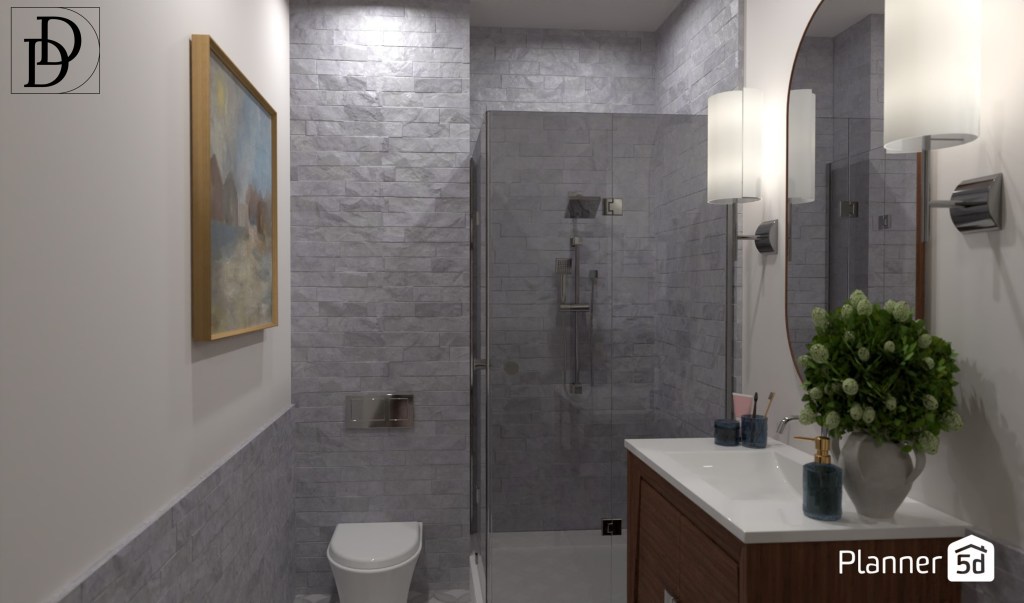 Банята е семпла, но елегантна. Използвах два вида плочки и много топъл интериорен цвят за стените като “Enchanted” на Бер и “Oyster” на Бенджамин Мур. Картината е репродукция на „Ранен сутрешен пейзаж“ от Едуин Хедли Холгейт.