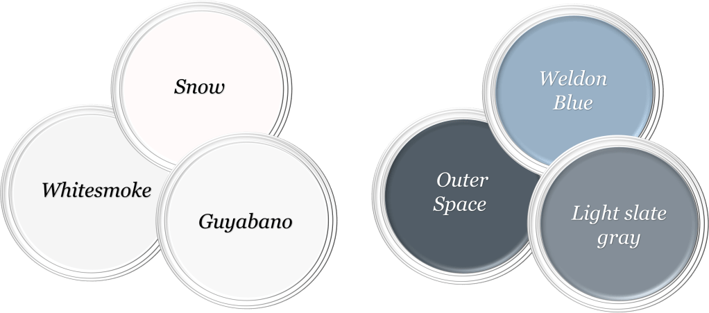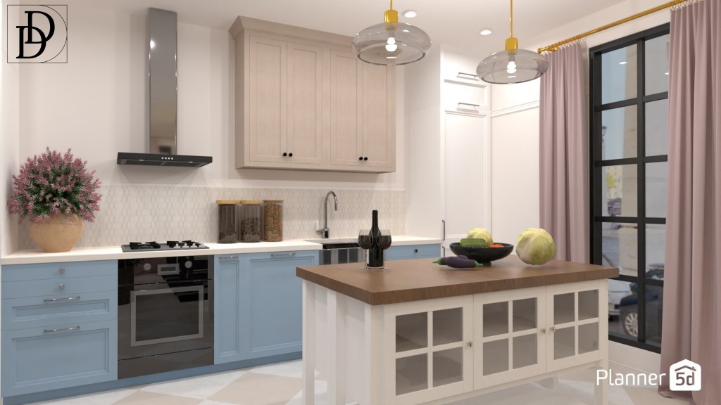 За цвета на стаята използвах снежнобял цвят, който е почти бял цвят, но с лек жълтеникав подтон, което придава мека топлина на стаята. Такъв цвят интериорни бои са примерно “All White” на Фароу и Бол и “Polar Bear” на Бер. Долните кухненски шкафове боядисах в синьозелен нюанс, който цвят се съчетава чудесно с розовите тонове в декора на помещението. Подобни цветове интериорни бои са “French Blue” на Бер и “Notable Hue” на Шъруин-Уилямс. Горните кухненски шкафове изпълних в дъб, а за плота на кухненския остров избрах орех.