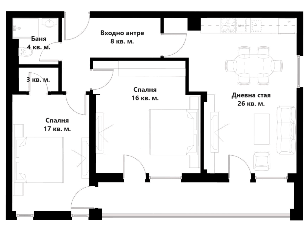 Проектирах проекта за млада двойка, която все още няма деца и се наслаждава идилѝчно на романтичната си връзка. Поради тази причина една от спалните превърнах в хол, а дневната стая в кухня и трапезария.