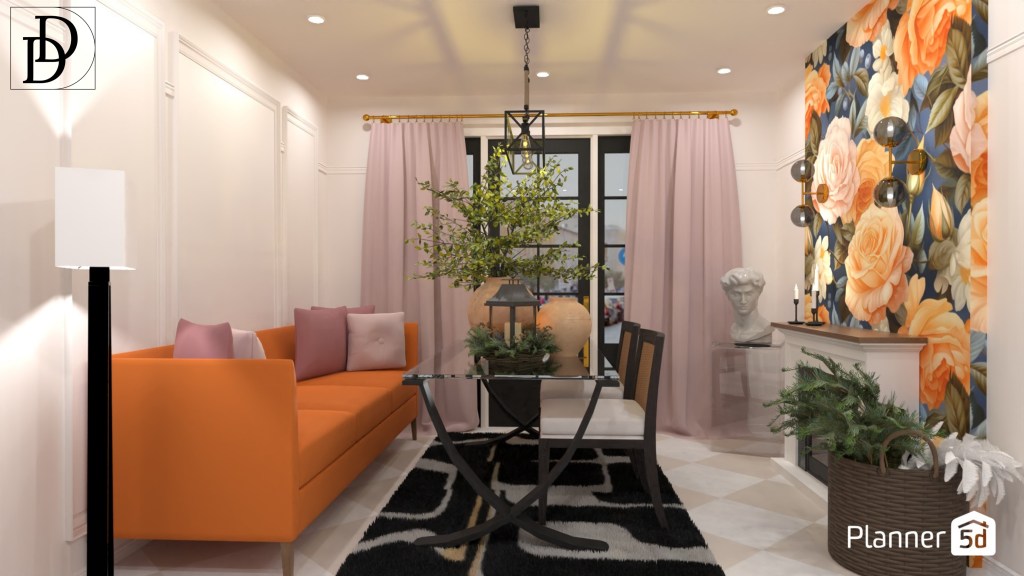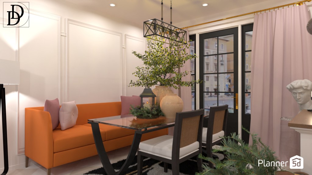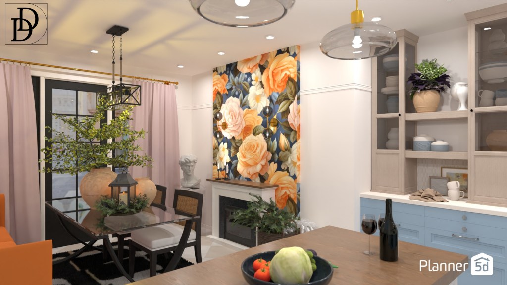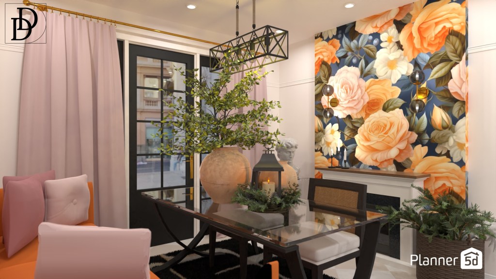 Идеята ми за трапезарията бе да създавам усещане, че си навън в цветна градина. Продължих романтичната идея от кухнята, но повдигнах настроението с една октава по-високо, като внесох повече цвят, елементи и текстури. Така трапезарията доби по-енергично, оптимистично, секси и дори леко наперено настроение. Като двама влюбени, вплели погледи един в друг и виждащи всичко през розови очила.
