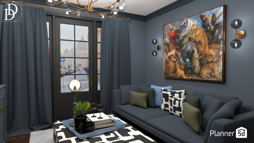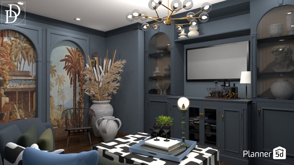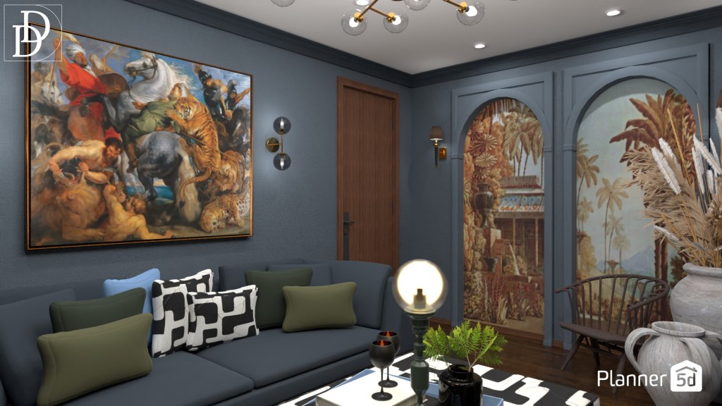 Стените на хола са боядисани в светло сив цвят като интериорните бои “Forever Denim” на Бер и “Storm Cloud” на Шъруин-Уилямс. Первазите на тавана и TV секцията са боядисани в средно тъмен нюанс на синьото. Подобен цвят интериорни бои са “Midnight Blue” на Бер и “Tarragon” на Шъруин-Уилямс. Внесох нотка модерност с дивана и масата-табуретка в декора на помещениено, както и ориенталски елемент с тапета и стенното изкуство. Това са все важни характеристики за един по-модерен и свеж интериорен декор в стил Английска провинциална къща. Тапетът се казва „Вилата“ на компанията Cara Saven Wall Design, част от тяхната Винтидж колекция тапети, а картината е репродукция на „Лов на тигри“ от Питър Пол Рубенс.