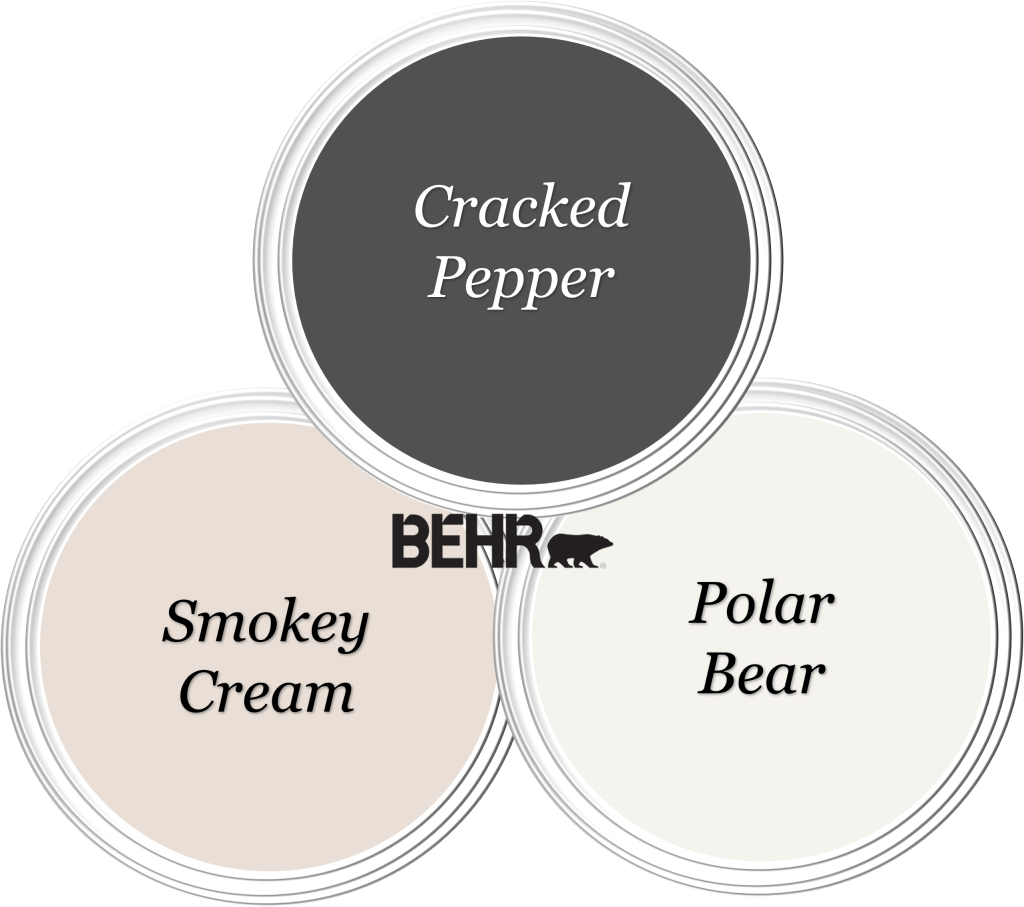 Признавам, че изключително много харесах боята на Бер за 2024 год. „Cracked Pepper“. Този саждисто черно-сив цвят се съчетава прекрасно с песъчливи и теракотени текстури и нюанси. Комбинирах я със „Smokey Cream“ за стенната облицовка и „Polar Bear“ за тавана.
