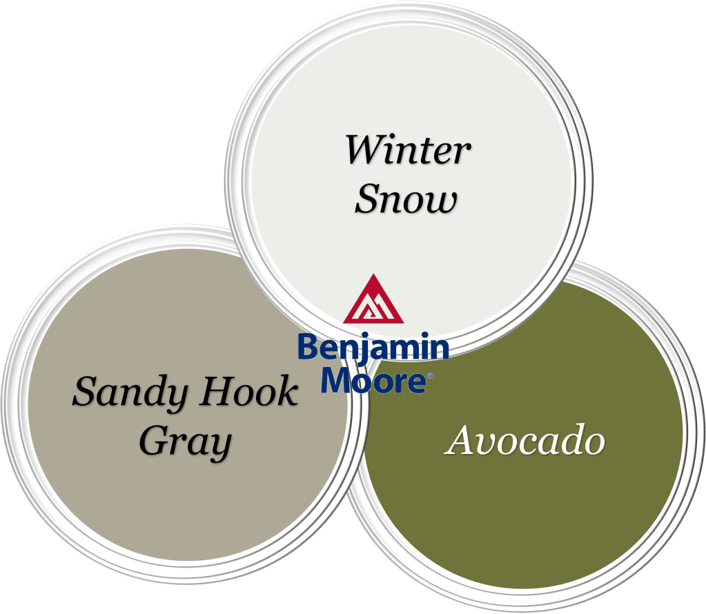 В този вариант боядисах цялата кухня, както и стаята в елегантния оптичен бял цвят със сини нюанси, наречен „Winter Snow“ на Бенджамин Мур. За да добавя контраст и топлина оцветих стенната облицовка в класическата сива боя със зелени подтонове „Sandy Hook Gray“ на марката.