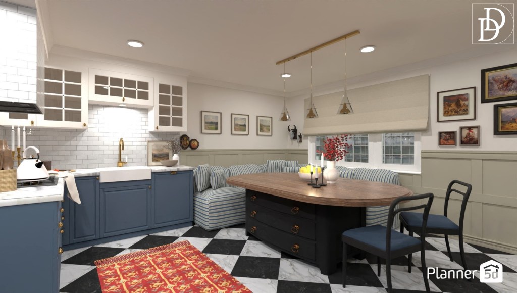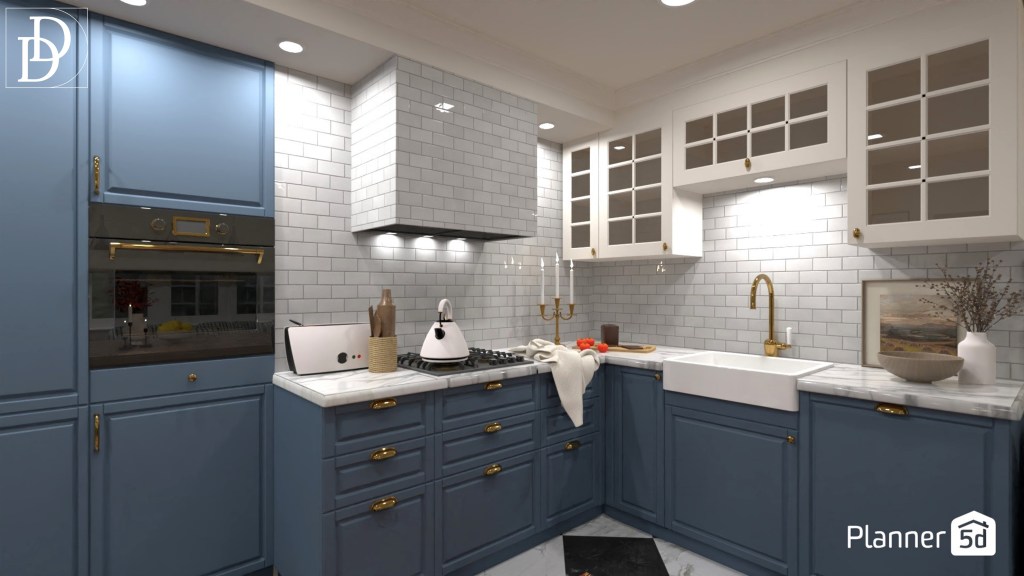 Кухня в синьо и бяло е класика. В този пример избрах да боядисам долните кухненски шкафове в небезизвестната боя „Van Deusen Blue“ на Бенджамин Мур. Избрах този нюанс на синьото, защото цветът си подхожда, както с по-традиционни, така и с по-модерни интериорни стилове.