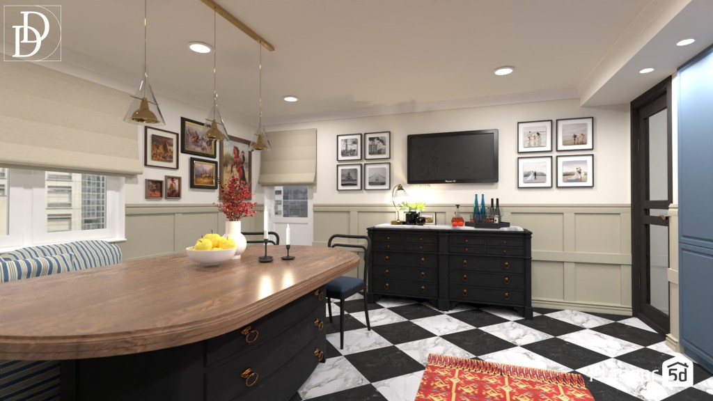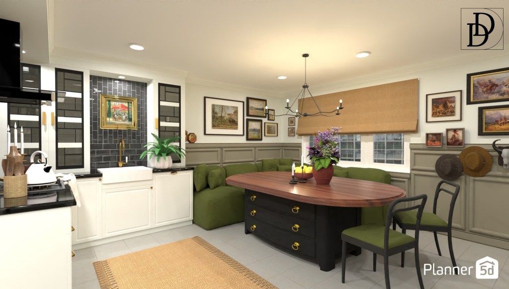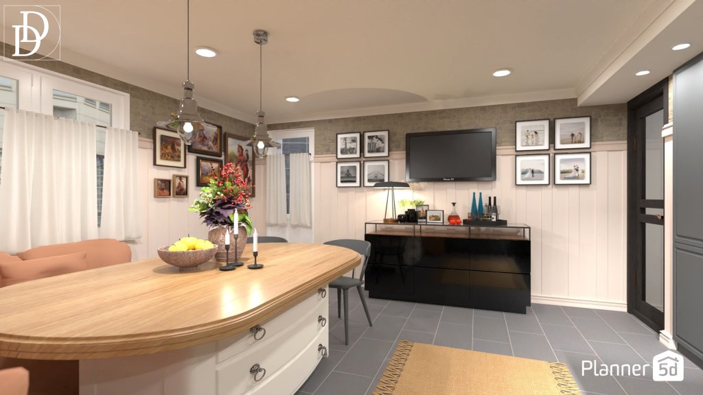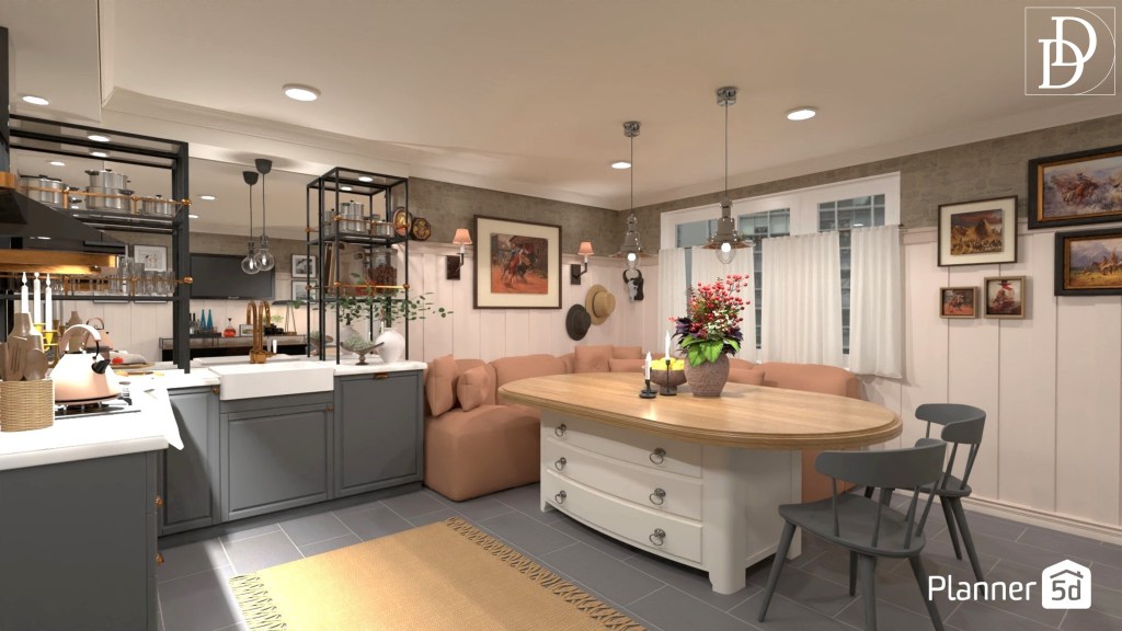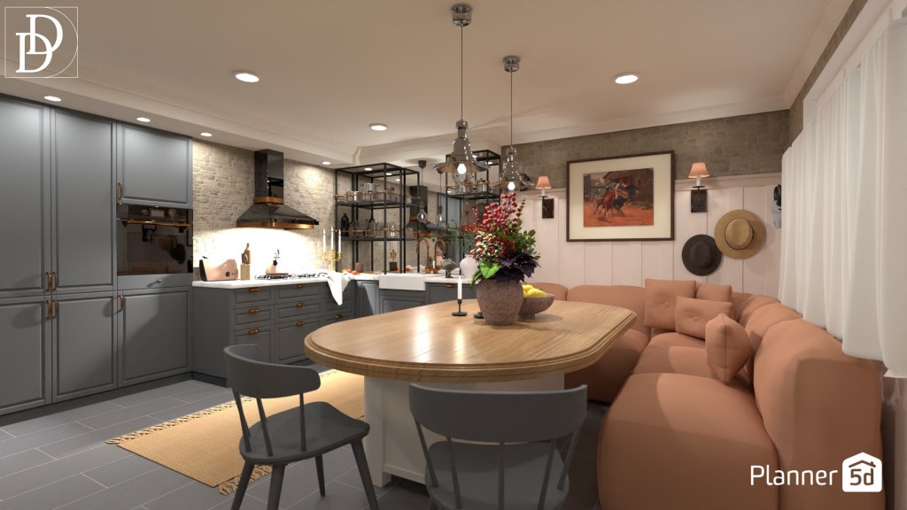 Мисля, че този дизайн на бистро кухня се получи много очарователен и чувствен. Цветовата палитра и декора на помещението е приятно балансирана между по-традиционните и женствени елементи от дизайна (кухненския остров/трапезната маса, стенното огледало, декоративната облицовка, дивана, пердетата и др.) и по-модерните и мъжествени характеристики на интериора (високите до тавана метални рафтове, каменния кухненски гръб, индустриалните осветителни тела, шкаф-конзолата под телевизора и т.н.).