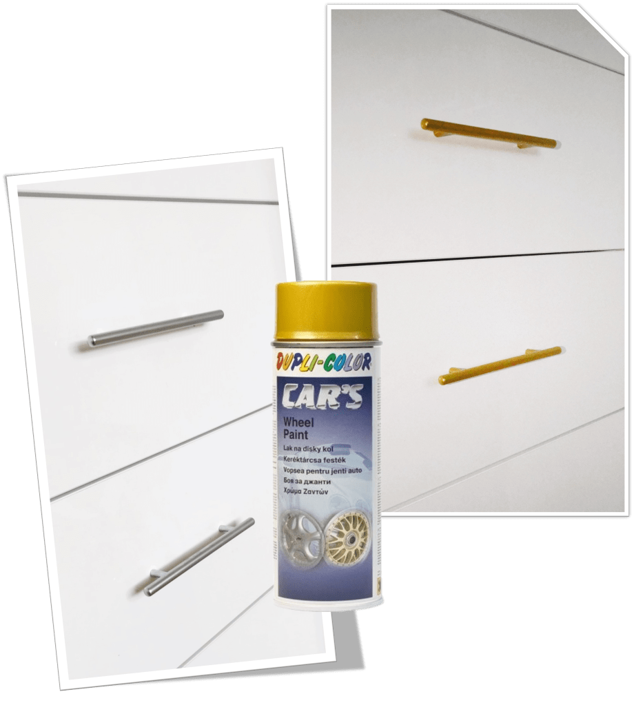 За да са в един тон металните елементи в стаята, позлатих дръжките на гардероба със спрей боя за джанти. За по-голяма устойчивост след това ги препокрих и с безцветен лак за боя.