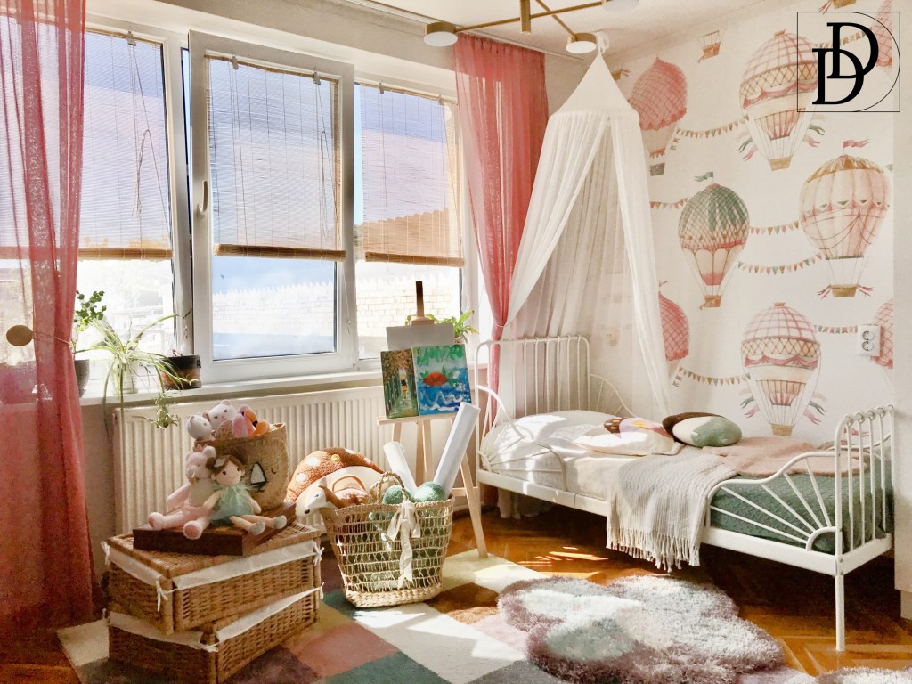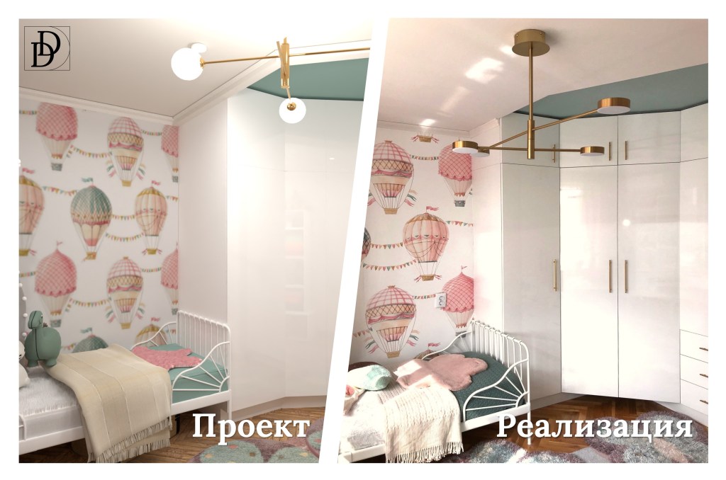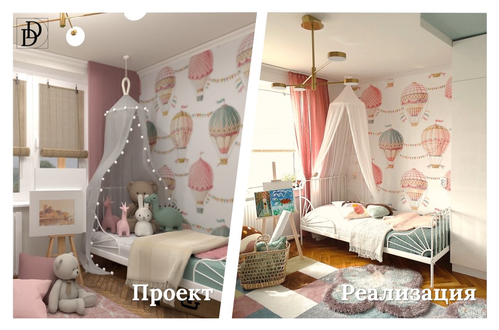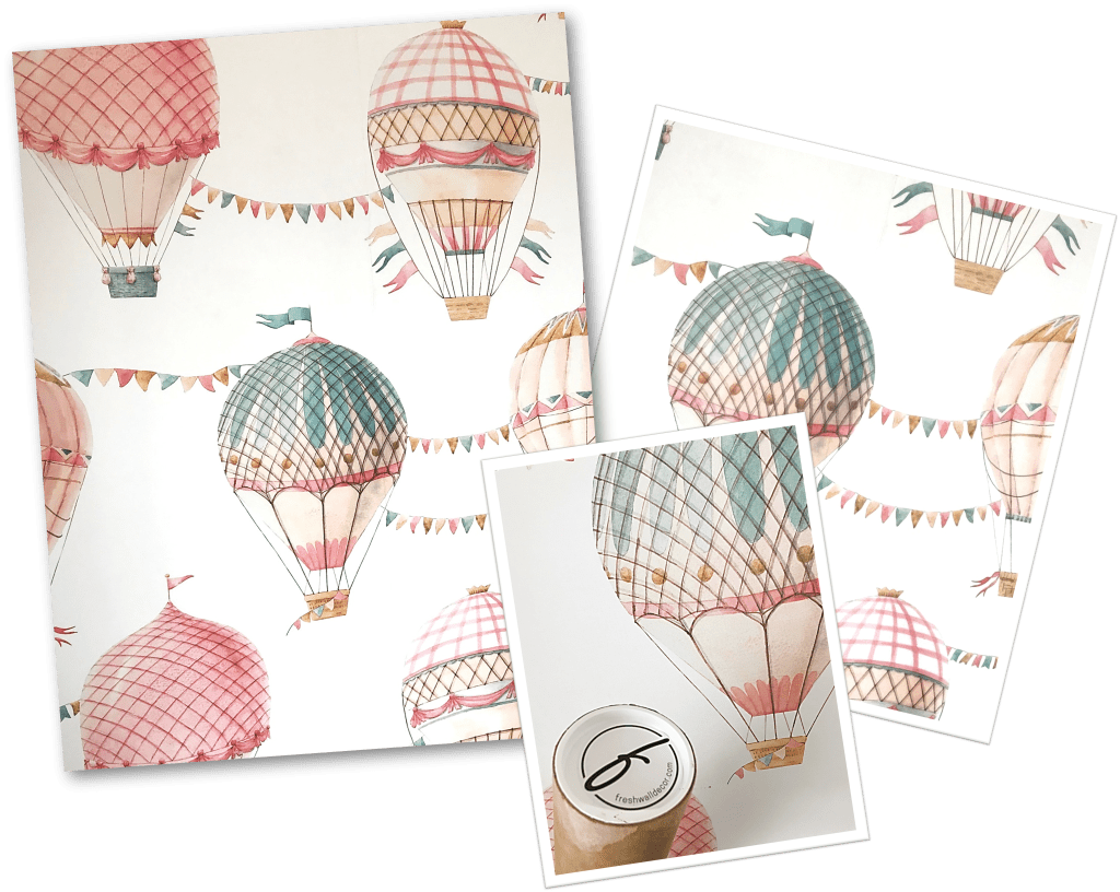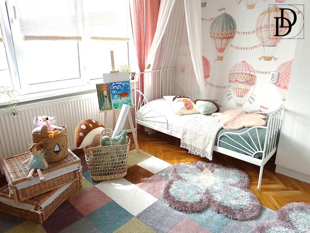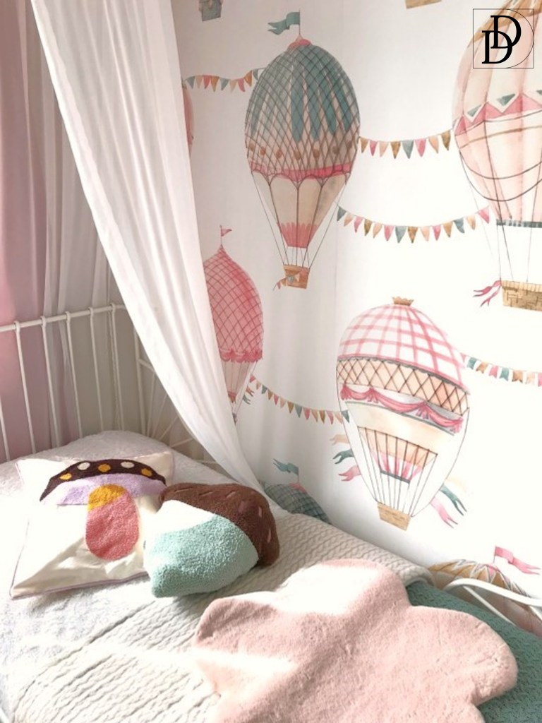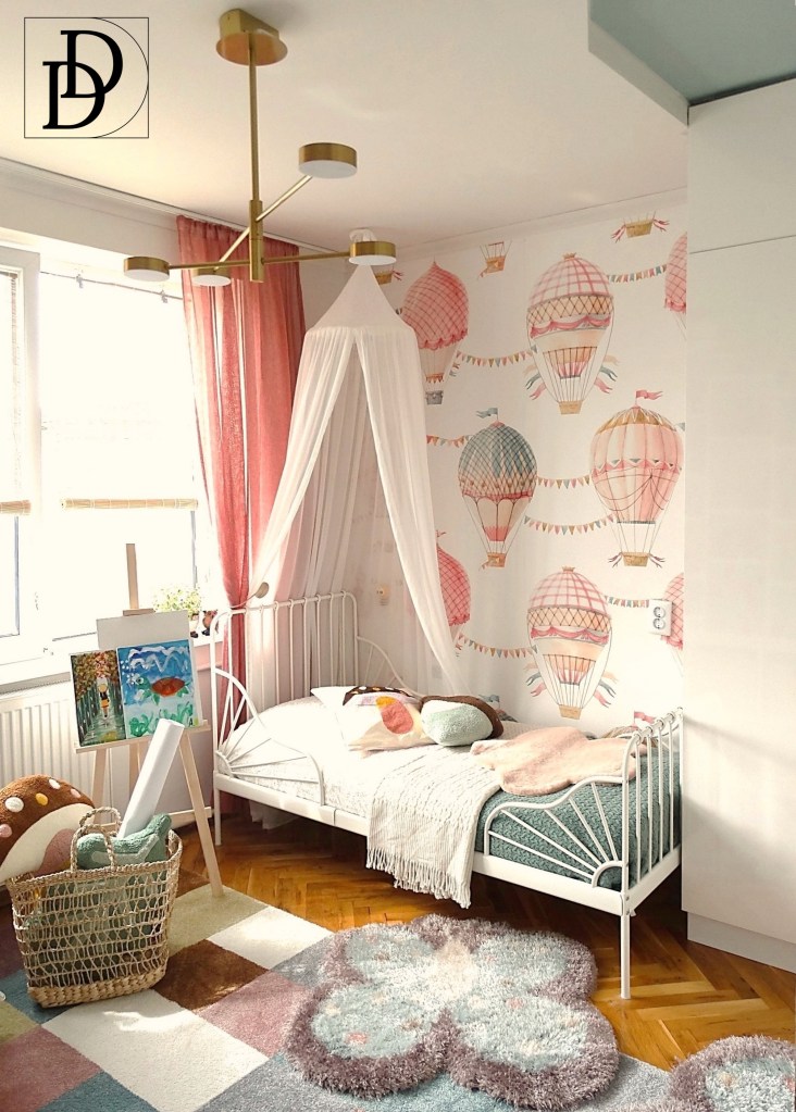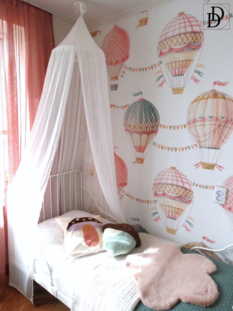 Когато започнах да работя по интериорния проект на помещението преди шест месеца, попитах детето си как си представя бъдещата си стая. Отговорът ѝ бе – приказна розова стая с тапети. След проучване в интернет попаднах на фирма, с много богат набор от красиви тапети за детски стаи – www.freshwalldecor.com. Оставих момиченцето си да избере сама тапета с мисълта, че ще лепя еднорози по стената. Тя, за мое огромно учудване, се спря на тапет на балони с горещ въздух.