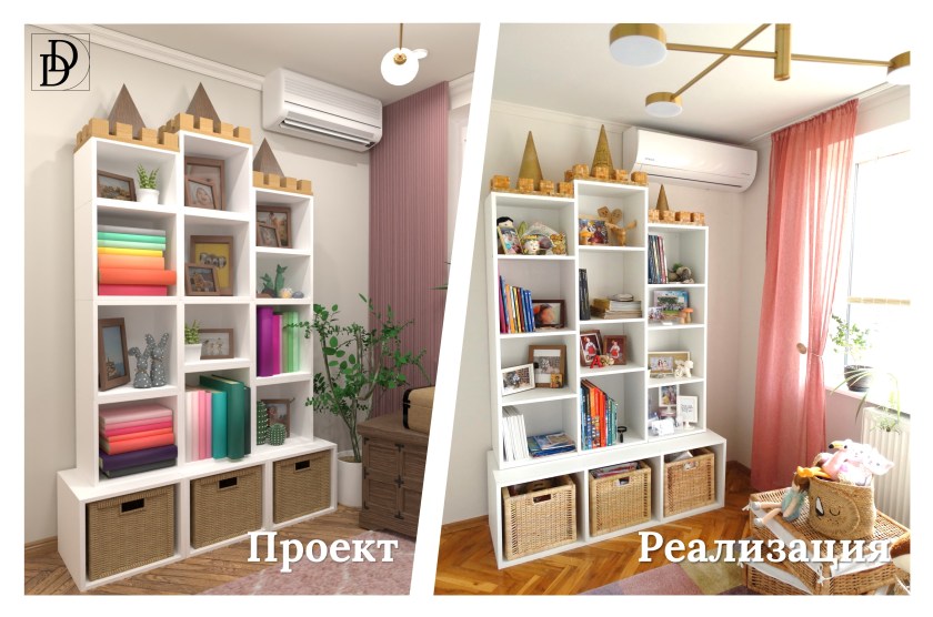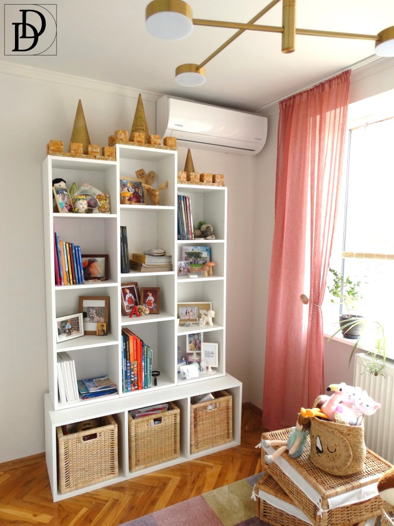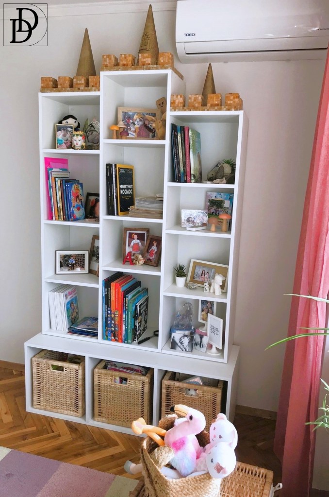 Много държах в стаята да поставим библиотечка, подходяща за поместване на всякакви по размери книги. Днес детските книги, учебниците и енциклопедиите са изключително разнообразни, като най-големите, които детето ми има, надминават 40 см. на височина. Допълнително, исках да има и шкафове, където да се прибират арт пособията ѝ, както и достатъчно рафтове за снимки и различните ѝ колекции от камъчета, кристали, фигурки и прочее. Понеже не намерих нищо подходящо по магазините и в Интернет, изработих сама проекта. Закупихме готови нарязани и кантирани ЛПДЧ бели плоскости от варненската фирма Джи и Ем ЕООД и я сглобихме сами. Във финансово отношение нашата направи си сам библиотечка, която с рафтоносачите, планките и другите материали излезе общо около 220 лв., ни струва много изгодно. Това, разбира се, е препоръчително само ако разполагате с чифт сръчни ръце.