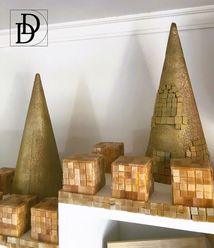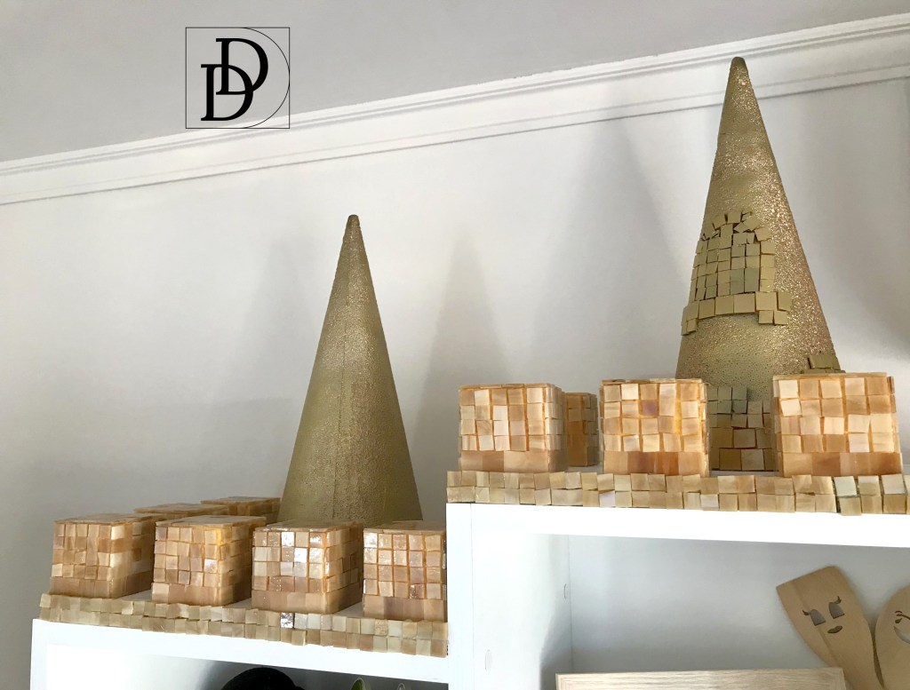 Размишлявах дълго и търсих различни варианти как да изработя кулите над стелажите на библиотечката. Накрая се спрях на варианта да поръчам фигури от стиропор и стъклени мозаечни плочки от онлайн магазина INDUSTRIAL e-SHOP и прекарах няколко часа от свободното си време в лепене. Крайният резултат си заслужаваше абсолютно всяко усилие, защото кулите като на замък внесоха наистина приказното настроение в стаята на детето.