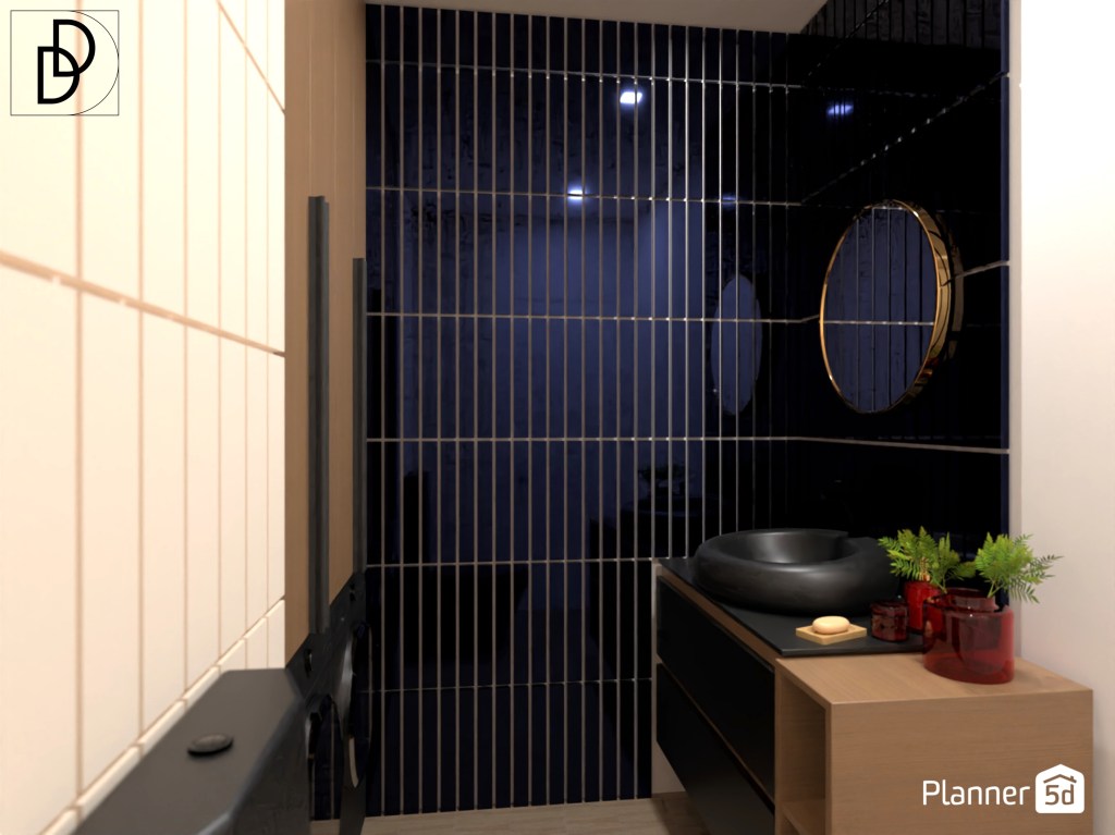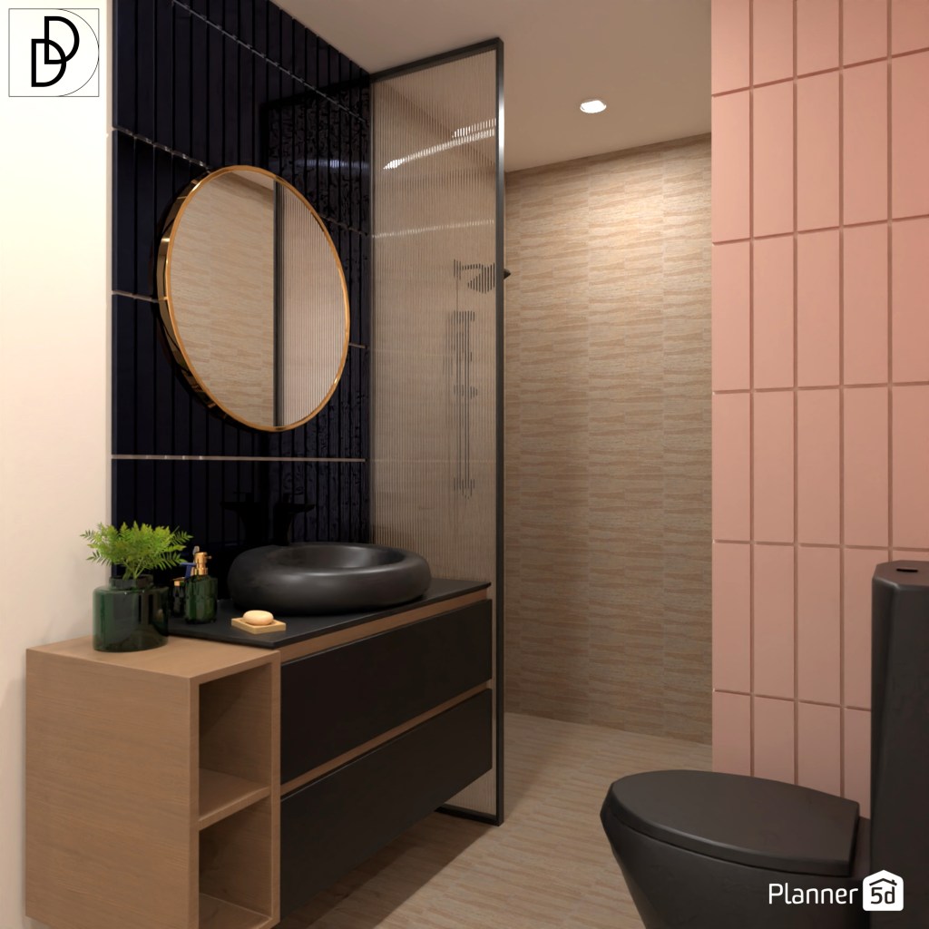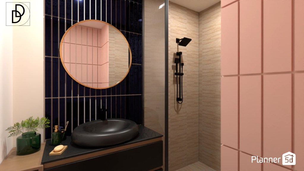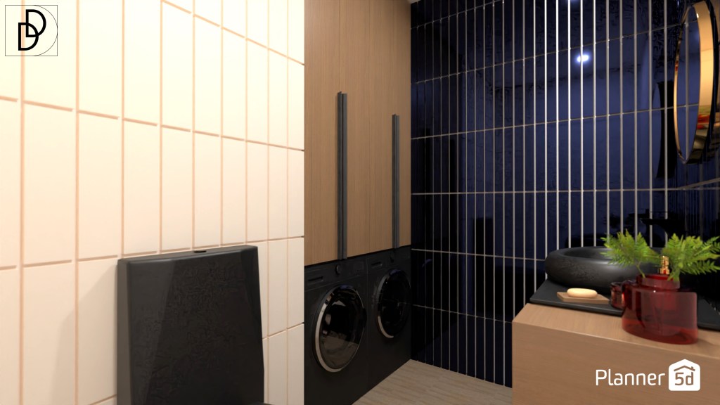 Апартаментът има баня и мокро помещение, което разполага и с допълнителна тоалетна. За обзавеждането им използвах три вида плочки: полирани стъклени плочки в тъмносин цвят; матирани порцеланови плочки в нежно розов и кремаво бял нюанс и кафеникави керамични плочки, подходящи, както за под, така и за стена.