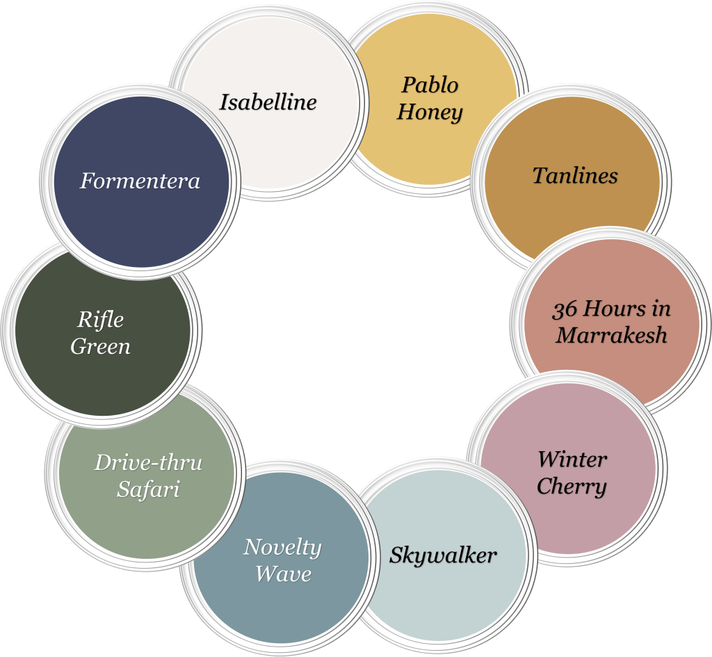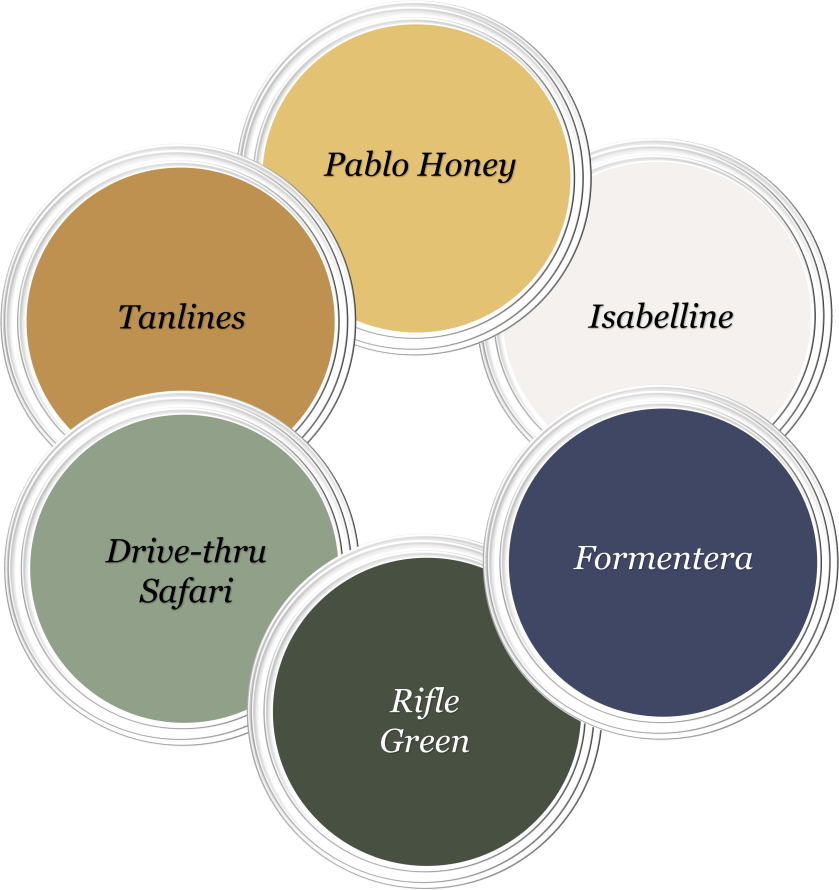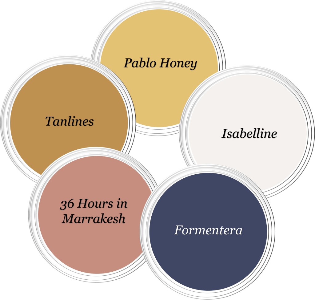 Основният цвят в цветовата схема, която избрах за декора на дома, се казва „Formentera“. Това красиво синьо е кръстено на най-малкия от испанските острови в Средиземно море и всъщност е тъмно, сенчесто, черничево лилаво с кралскосин подтон. „Formentera“ е абсолютен хамелеон и се съчетава красиво с оранжево-жълти, червеникаво-розови, пастелни цианови и тревисто зелени тонове. Стените и таваните в цялото жилище са боядисани в много светло оранжевия цвят „Isabelline“. Подобен цвят интериорни бои са „Luster White“ на Бер, „White Zinfandel“ на Бенджамин Мур и „Snowy Mount“ на ППДжи. За по-голямата част от подовото покритие в апартамента избрах кафяви керамични плочки на мотиви, а за паркета в стаите и дървените мебели се спрях на плоскости от лиственица.