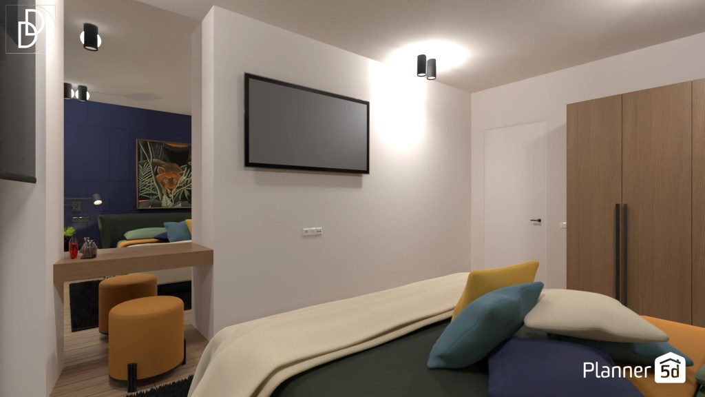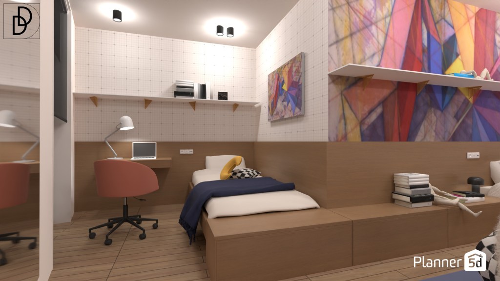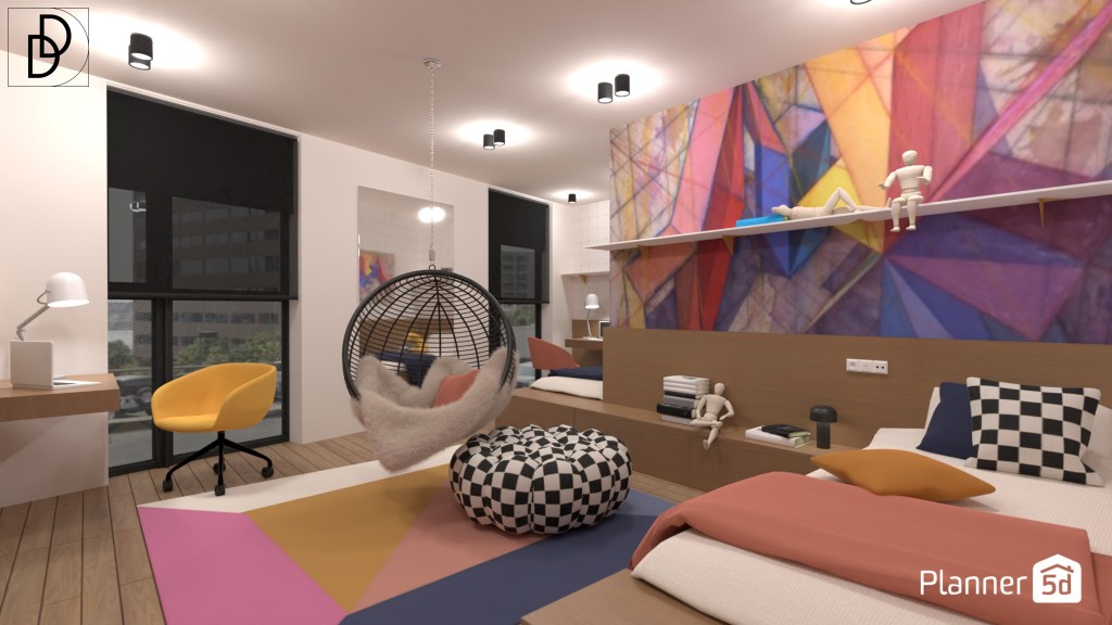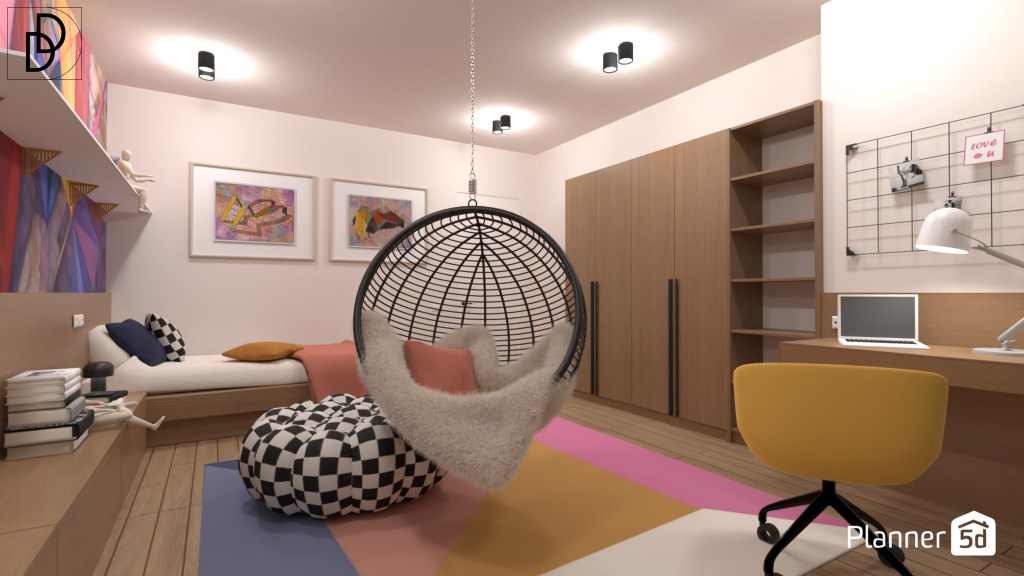Детската стая проектирах за две момичета близначки в юношеска възраст. Декора ѝ е изцяло вдъхновен от творчеството на американския художник Роналд „Рон“ Дейвис. Работата му е свързана с геометрична абстракция, абстрактен илюзионизъм, рисуване с цветни полета и 3D компютърна графика .