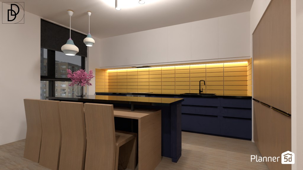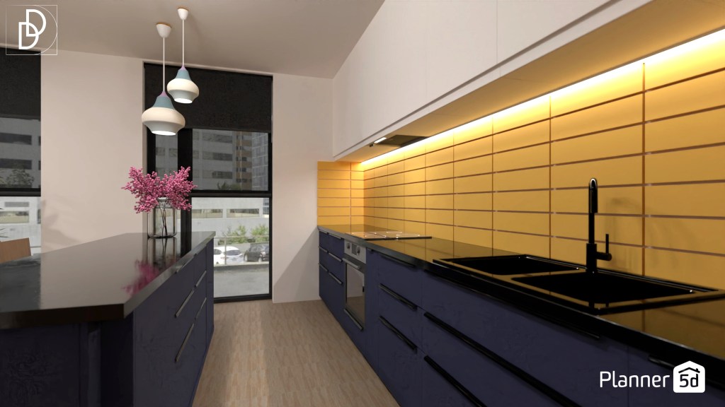 В кухнята съчетах изчистени шкафове до тавана в цвят „Isabelline“, с модерни долни шкафове в цвят „Formentera“. За кухненския плот и острова използвах черен гранит, а за кухненския гръб матирани порцеланови метро плочки в средно жълт цвят. Допълнително, за плочките приложих актуалната редова хоризонтална подредба.