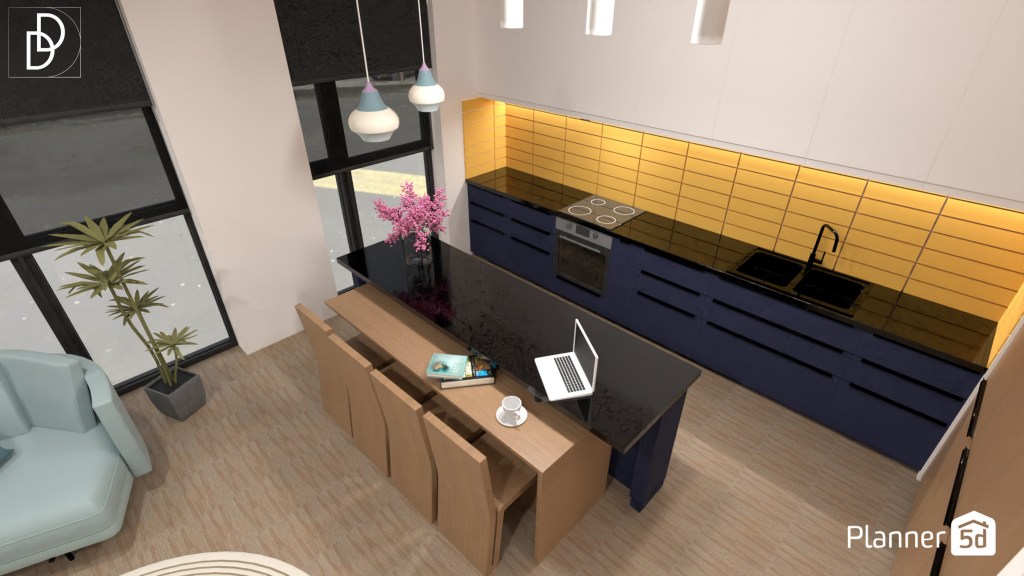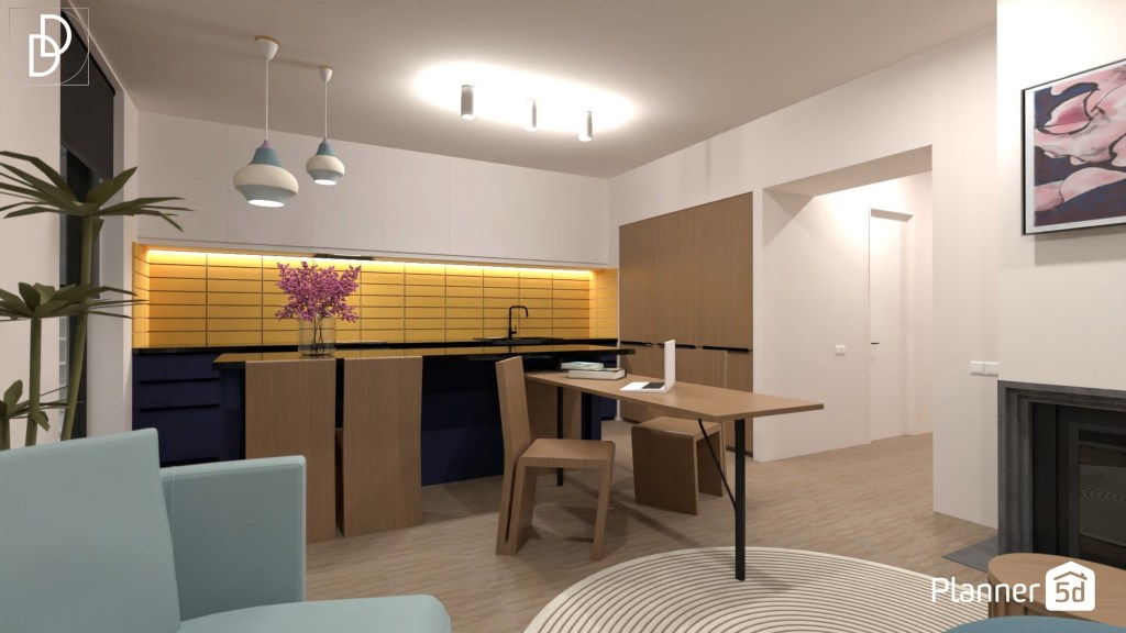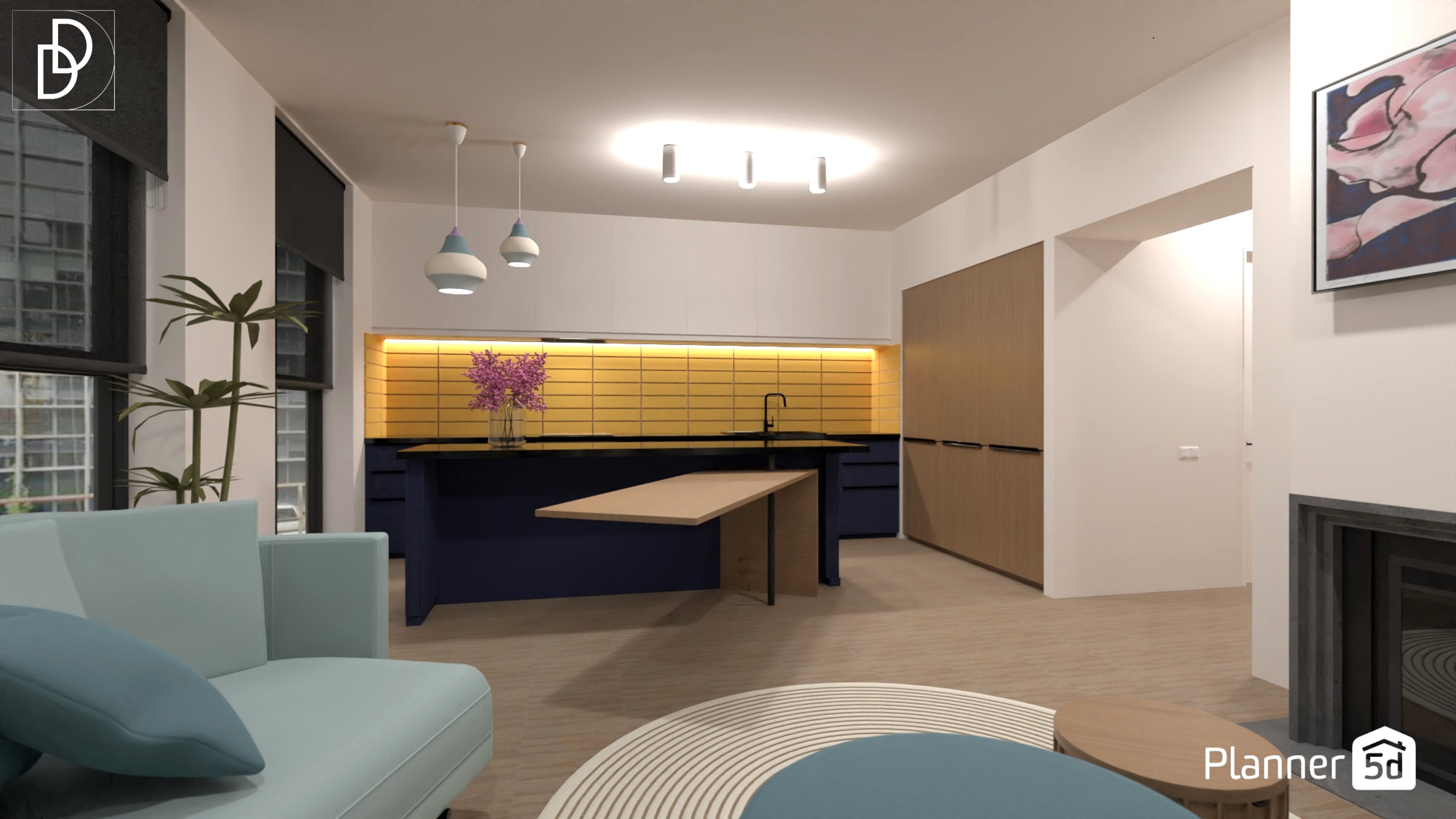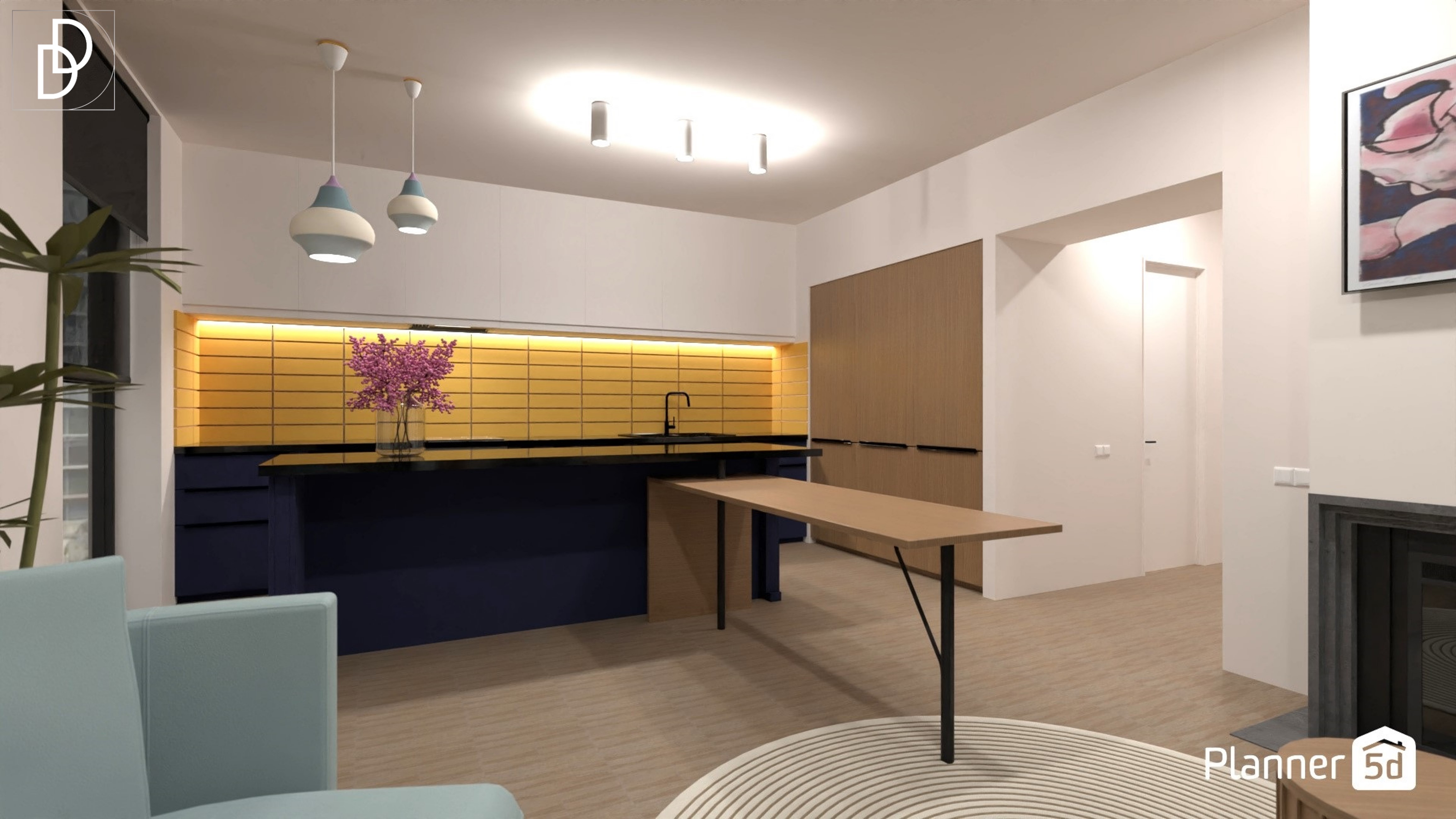 Кухнята и всекидневната са поместени в едно помещение, но пространството е 32 кв. м., което не е достатъчно за пълен отворен план. Правилото е минимум 35 кв. м. чиста жилищна площ, за да поместим в едно помещение кухня с кухненски остров, трапезна маса със столове и диван с холна масичка и всяко едно пространство да се чувства просторно, и да функционира добре само по себе си. Обикновено, когато стаята не е достатъчно голяма избираме между една от две опции – или кухненския остров отпада или трапезната маса замества холната масичка, а дивана – трапезните столове. Напоследък се налага интериорните дизайнери да разглеждат и третата опция – кухненски остров и трапезна маса в едно, тъй като все по-често се срещат около 20 кв. м. квадратни всекидневни стаи при новото строителство. В случая обаче имаме от една страна правоъгълна стая, а от друга модерният интериорен стил не позволява комбинацията от диван с трапезна маса. Ето защо се наложи да измисля по-съвременна версия на „островомасата“. Разгъваемата маса, която проектирах, е с размери 60 см. ширина на 200 см. дължина и е скрита частично под острова (около 40 см.). Въпреки това, когато е сгъната, издаденото пространство позволява да се постави спокойно чаша кафе и чиния със закуска. Вечер семейството може да се събере на вечеря около разгърната маса или децата да я използват като бюро за домашните си работи.
