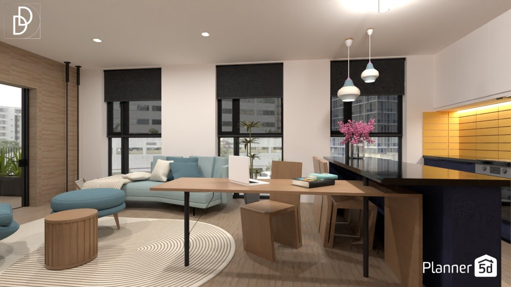 Жилището е просторно, с прекрасно разпределение и е част от новопостроен жилищен комплекс с интересни геометрични архитектурни елементи. Това донякъде налага вътрешният декор на дома да бъде повлиян от модерния интериорен стил.