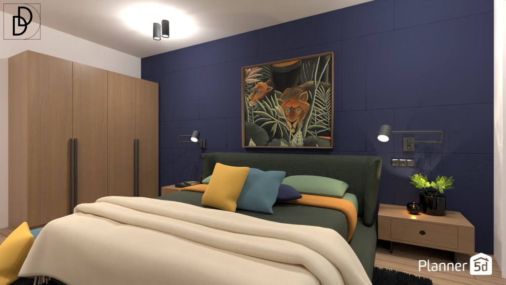 Реших да превърна стената зад леглото в акцентна, като я боядисам в тъмносиния цвят от цветовата палитра. Подобни интериорни бои са „Nobility Blue“ на Бер и „Royal Hyacinth“ на ППДжи. Приложението на ярки и наситени цветове в спалните помещения придава повече уют и интимност на пространството, но по мое мнение, боите в скъпоценни тонове изискват и внасянето на допълнителен архитектурен елемент в декора на помещението. Ето защо облицовах стената в елегантна ламперия с модерна визия.