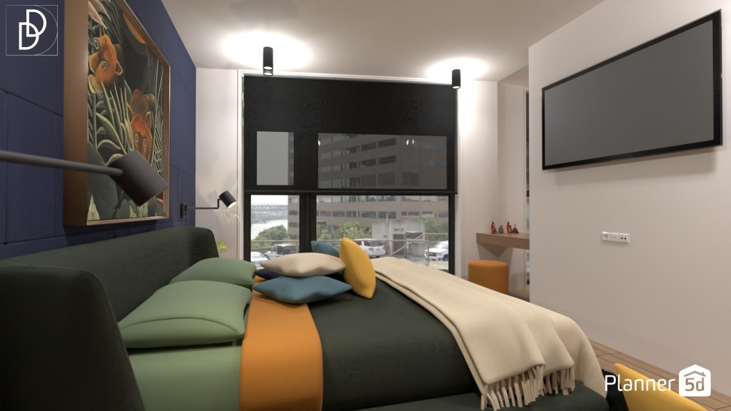 Цветовата схема в спалнята на родителите е сходна с палитрата на всекидневната стая и кухнята, като замених само циановите и розови тонове със зелени и оранжеви.