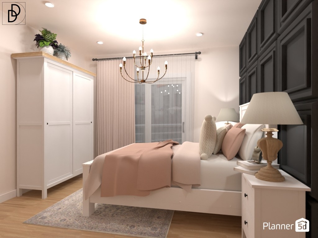 Вярвам, че стилът на модерната фермерска къща е много романтичен. Ето защо реших да подчертая тази негова отличителна черта като изпълних главната спалня в черно и розово. Фокусната точка в интериора на помещението е акцентната стена зад леглото, която облицовах в ламперия в стил „Ар деко“ и боядисах в цвят „Черен лебед“. Всъщност „Черен лебед“ е много тъмен нюанс на сивото и си подхожда чудесно с зелените тонове от палитрата на проекта. Подобен цвят интериорни бои са „Carbon Copy“ на Бер и „Night Jewels 2“ на Дулукс.