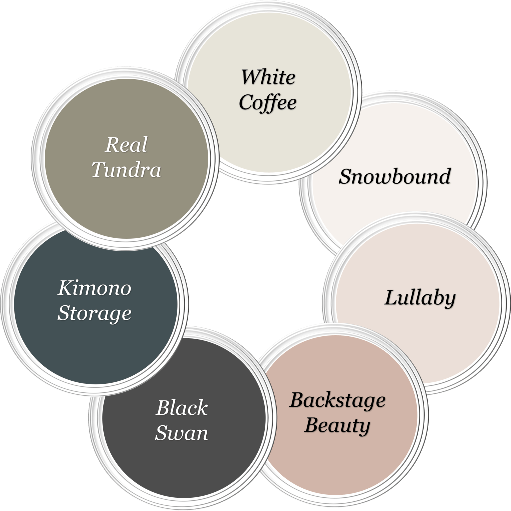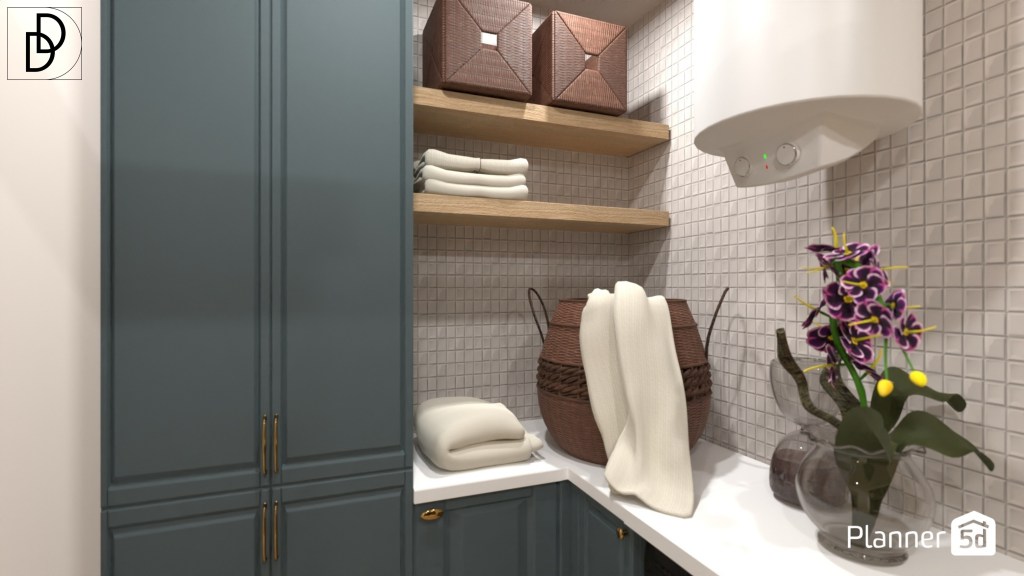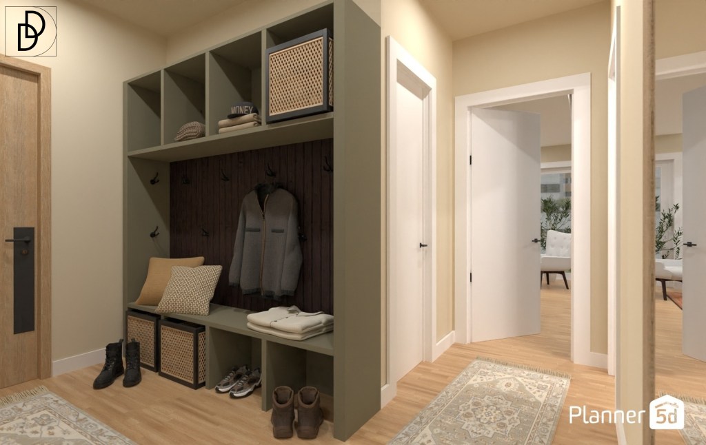 Цветовата палитра е релаксираща, успокояваща и заземяваща, в топли земни тонове. Основният цвят, който избрах за цветовата палитра на жилището, е „Real Tundra“. Този цвят всъщност е едно много интригуващо кафяво, което има приятен зелен подтон. Подобни интериорни бои са „Sage Mountain“ на Бенджамин Мур, „Muted Sage“ на Бер и „Sylvan“ на ППДжи. Комбинирах „Real Tundra“ с дълбокия и дързък синьозелен цвят „Kimono Storage (Omeshionando)“. Сходни бои са „Narragansett Green“ на Бенджамин Мур, „Tarragon“ на Шеруин Уилямс и „Obsidian“ на ППДжи. Стените в антрето и кухнята на апартамента боядисах в „White Coffee“, а сходни на него интериорни бои са „China White“ на Бенджамин Мур и „Arrowroote“ на Шеруин Уилямс. За стените на двете спални и мокрото помещение използвах цвят „Snowbound“, който има леко розов подтон. Подобни интериорни бои са „White Opulence“ на Бенджамин Мур и „Billowy Clouds“ на Бер. Приложих чам за ламинирания паркет в жилището, а повечето мебели в проекта са изпълнени в МДФ бял мат.