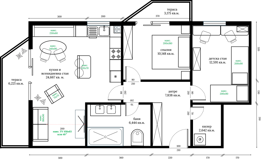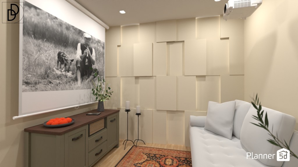 Всекидневната част от помещението е в действителност компактна с възможност за побиране само на двуместен диван и средноголям фотьойл. Телевизорът при тази дължина на стаята може да е с максимално 48 инча размер на екрана, но за сметка на това реших да включа в дизайна на стаята домашна кино система. В случая прожекционният екран е с размер на екрана от 75 инча и е с вграден разтегателен механизъм.