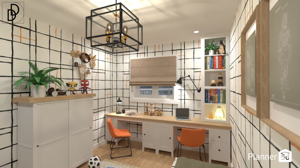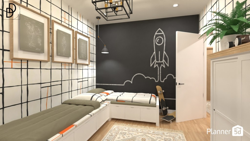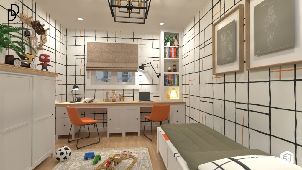 Детската стая на жилището проектирах за две малки братчета близнаци в начален етап на образование. Използвах тапет с модерна шарка за три от стените и самозалепваща дъска за рисуване за четвъртата. Допълних, интериорния дизайн на стаята с индустриално осветление.